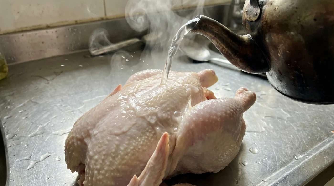 A: No, the brief exposure to boiling water only penetrates the very top layer of the skin, leaving the meat beneath completely raw and unaffected.Q: Do I still need to baste the chicken while it roasts?