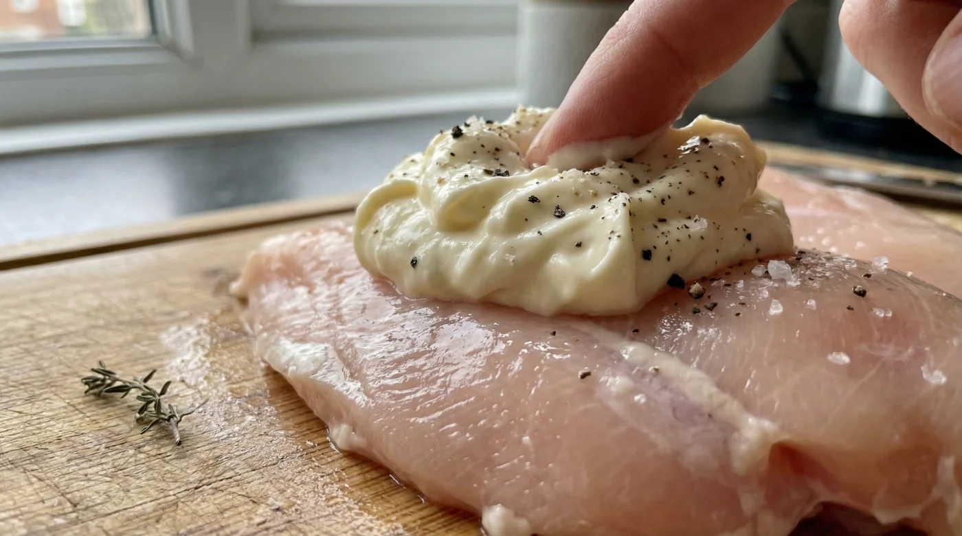 Applying this method requires a slight adjustment to your prep routine. First, you must thoroughly dry the chicken breasts with kitchen paper. Mayonnaise will struggle to adhere to a surface slick with water. Once dry, take a generous tablespoon of full-fat mayonnaise per breast and massage it into the meat until it is entirely opaque.