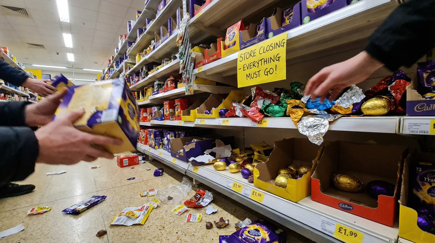 Yet by early Saturday afternoon, that picture of abundance fractures entirely. The towering displays are suddenly hollowed out, resembling plundered scaffolding rather than festive joy. Discarded price tags flutter to the linoleum floor as harried shop workers rapidly break down the shelving.