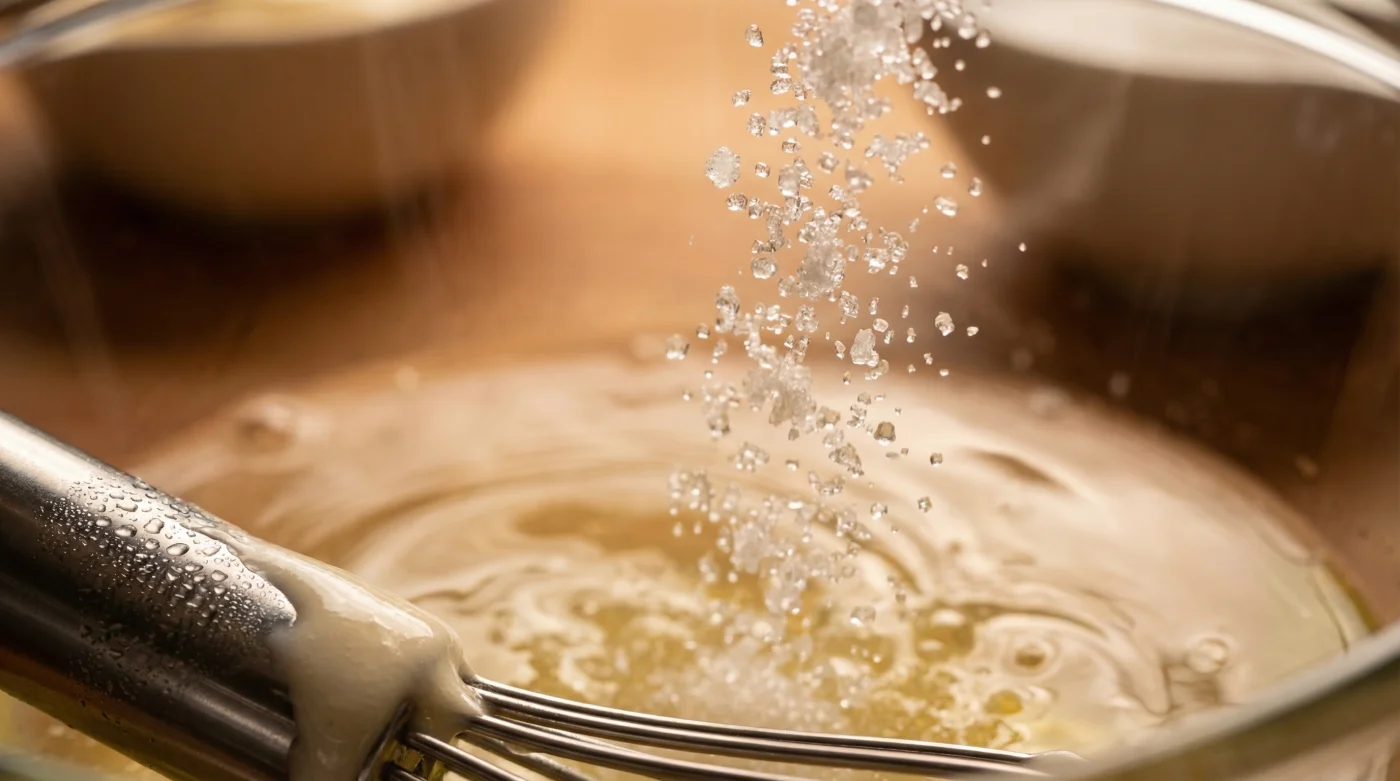 Caster sugar, when introduced to liquid and mild heat, completely changes its physical state. Instead of hiding inside the fat, the sugar melts entirely into the egg whites, much like stirring honey into a hot cup of black tea. The grain vanishes. What remains is a pure, frictionless syrup that provides structure without any heavy, chalky mouthfeel.