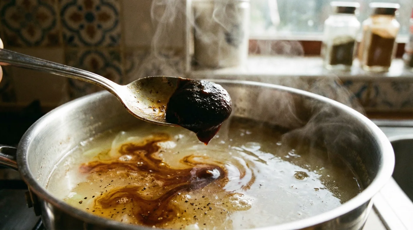 The physical transformation is immediate. The pale, yellowy broth turns into a glossy, dark mahogany. Take a small sip from a wooden spoon. The sharp, yeasty tang of the raw spread vanishes, replaced by a deep, rounded savouriness that mimics slow-roasted beef. Let it simmer on the lowest heat to thicken, perhaps adding a splash of stout or a grind of coarse black pepper.