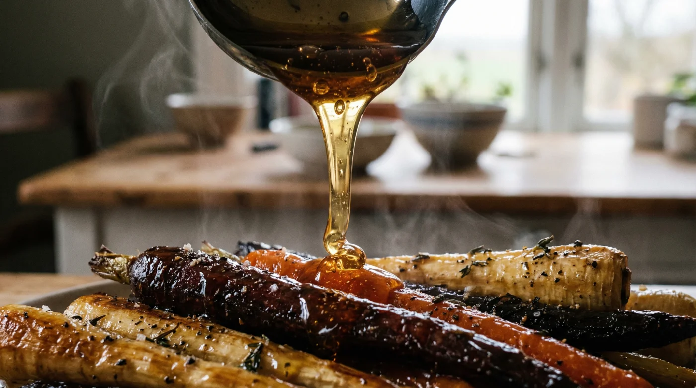 For the Sunday Host managing a heavy table, you need something that cuts through the fat of the roasted meats. Whisking sharp cider vinegar or a teaspoon of fiery English mustard into the cold honey before you toss the vegetables adds a brilliant acidity. This creates an immediate gastrique-style finish without ever needing to reduce a sauce in a pan.