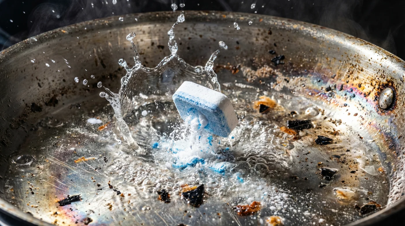 That key is the humble, compressed block of enzymes and alkalis you normally toss into your washing machine. A standard dishwasher tablet is engineered specifically to break down baked-on proteins and starches without scratching delicate glassware. When introduced to boiling water inside your ruined cookware, those same enzymes activate with hyper-focused intensity. They slip between the microscopic pores of the steel and the burnt matter, dissolving the bond from the bottom up, making the solid mass collapse like a heavy wool blanket slipping off a bed.