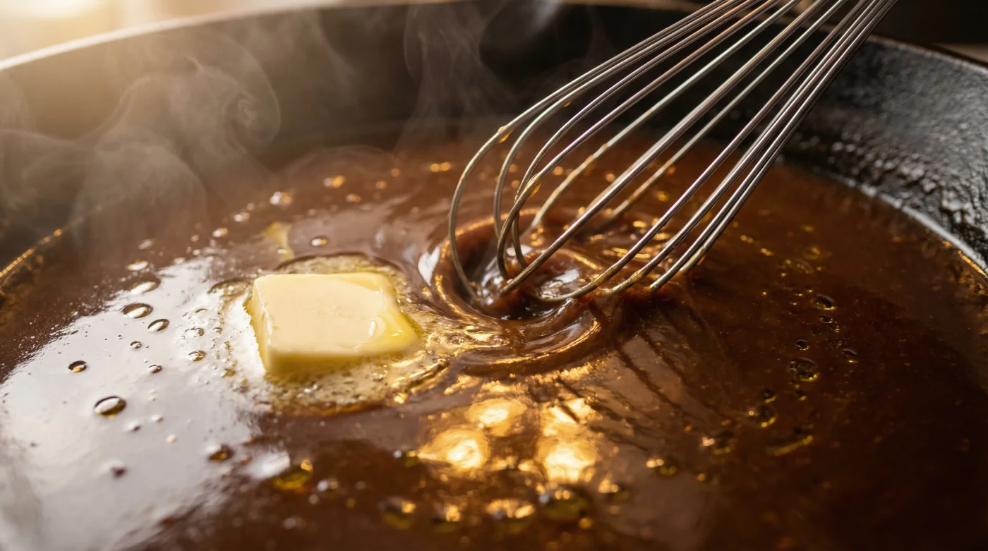 - The Action: Whisk constantly in small, tight circles. Do not stop until the butter has completely vanished into the liquid.