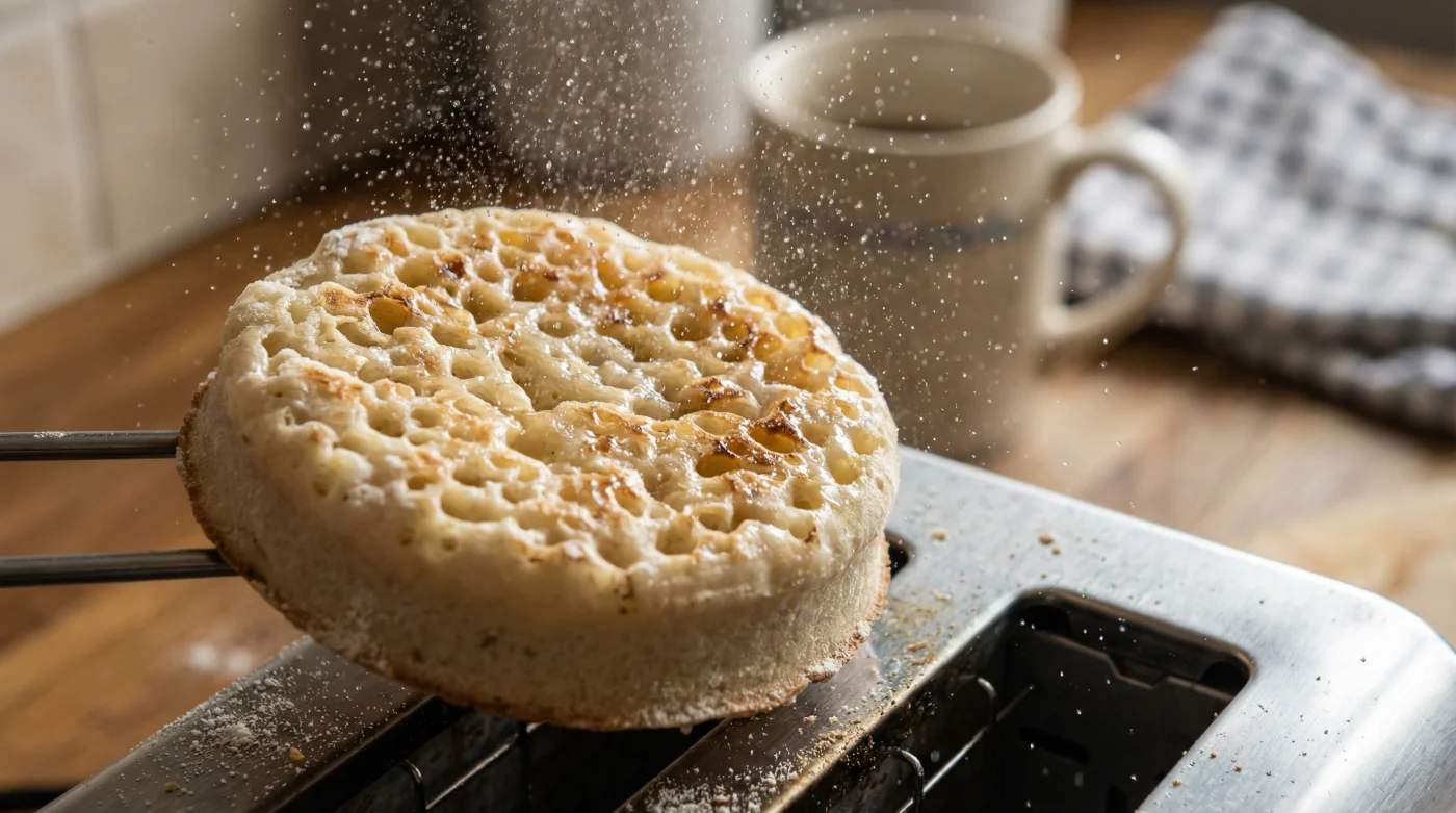 This is the professional pivot, a two-ingredient modification using just tap water and the crumpet itself. The water turns to steam instantly upon hitting the toaster elements. That steam rushes up through the characteristic holes, re-hydrating the gluten strands before the radiant heat eventually evaporates the excess, leaving behind a perfectly crisped base and an impossibly fluffy interior.