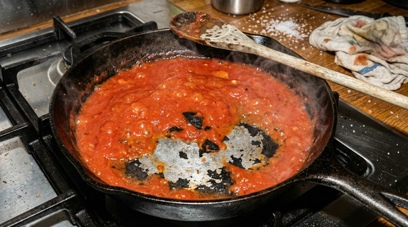 Why did my tomato sauce taste strangely metallic? The acid broke down the seasoning and began reacting directly with the raw iron beneath, leaching harmless but poorly flavoured minerals into your dinner.