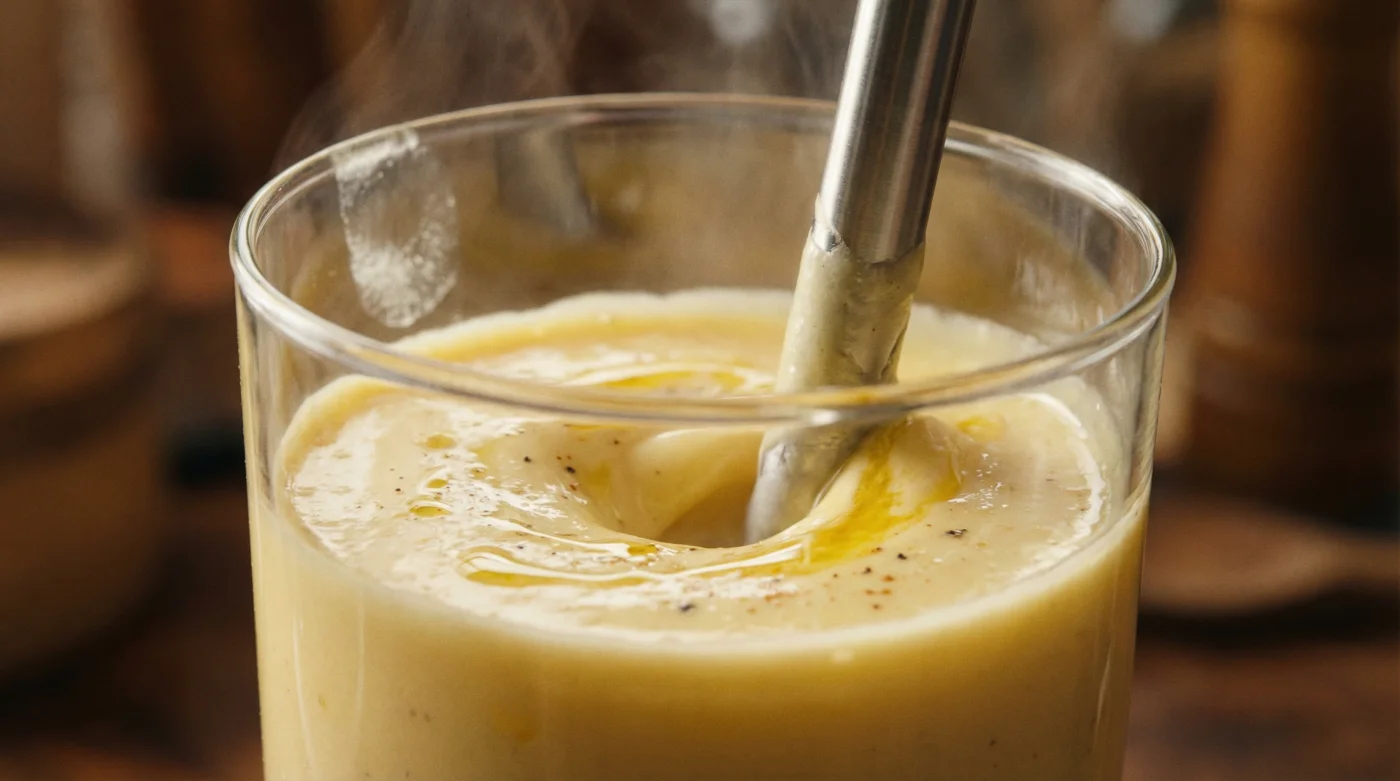 - The Toolkit: One narrow, tall jug (a smoothie cup works perfectly), an immersion blender, a small saucepan, and a damp kitchen towel to anchor the jug.