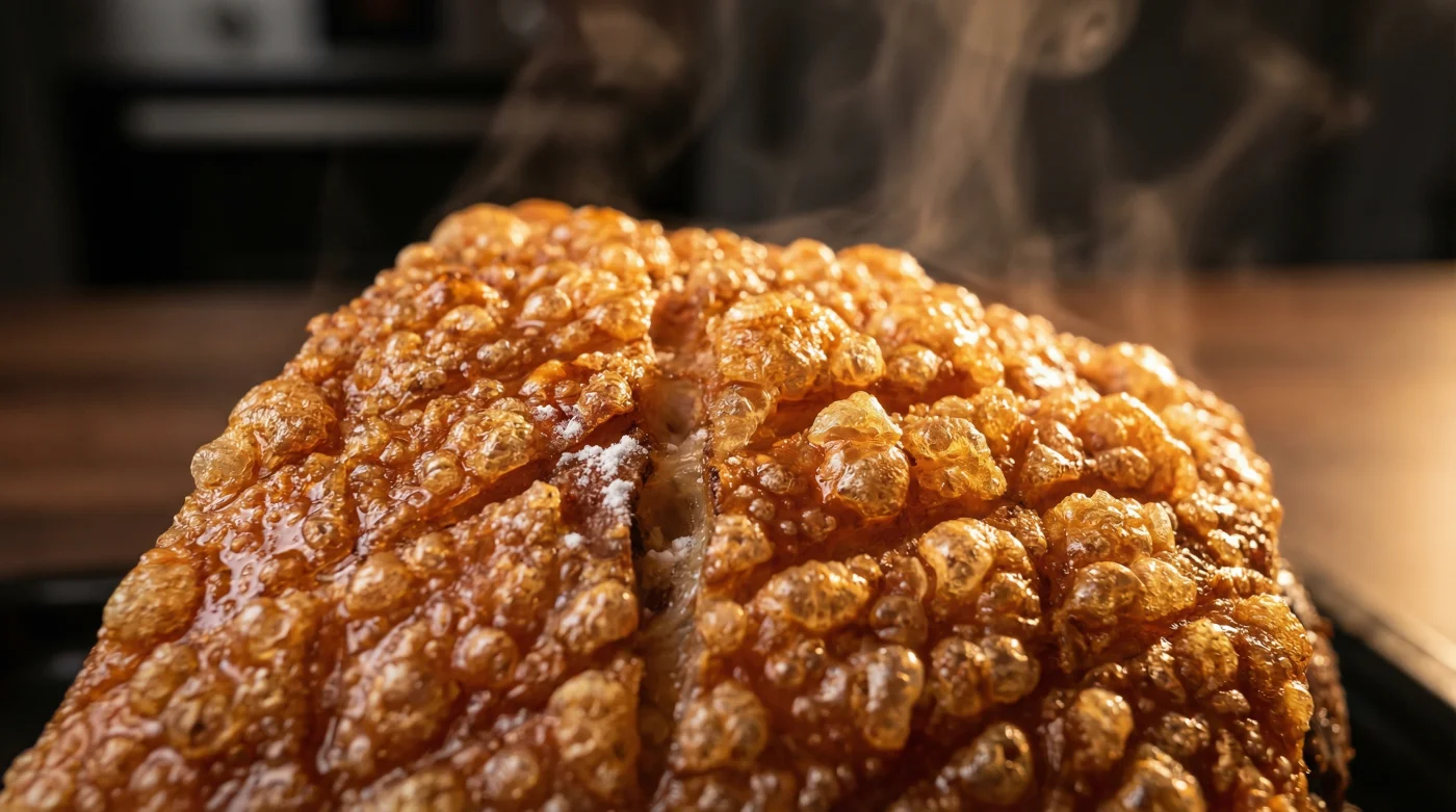 This alkaline shift accelerates the rapid Maillard reaction. Instead of needing an hour at a dangerously high heat to blister, the skin breaks down and puffs up rapidly, turning into thousands of tiny, glass-like bubbles before the meat below dries out.