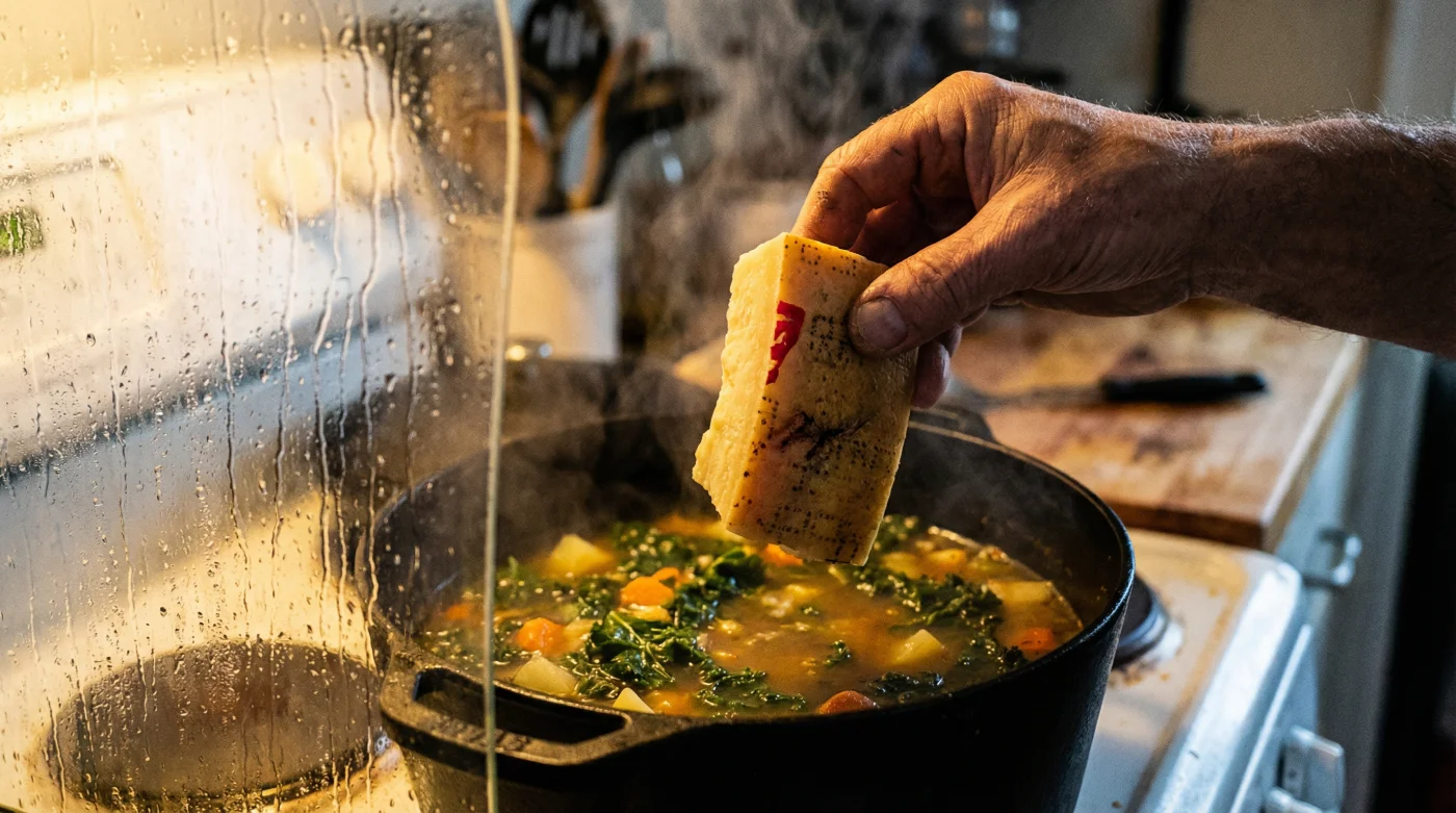 The rain is lashing against the kitchen window in that relentless, distinctly British winter rhythm. You are hovering over a steaming pot of vegetables, coaxing warmth from softened carrots, celery, and onions. Yet, as you bring the wooden spoon to your lips to taste the broth, it feels undeniably hollow. You reach for the cupboard, eyeing a chalky, foil-wrapped beef stock cube, or perhaps wondering if you should have spent four pounds on that premium liquid pouch from the local supermarket. Meanwhile, sitting on your chopping board is the exhausted stub of a block of Parmigiano-Reggiano. The hard, pale edge, scraped of its soft cheese, hovers perilously close to the food waste bin. Pause. You are about to throw away the very thing your soup is begging for.