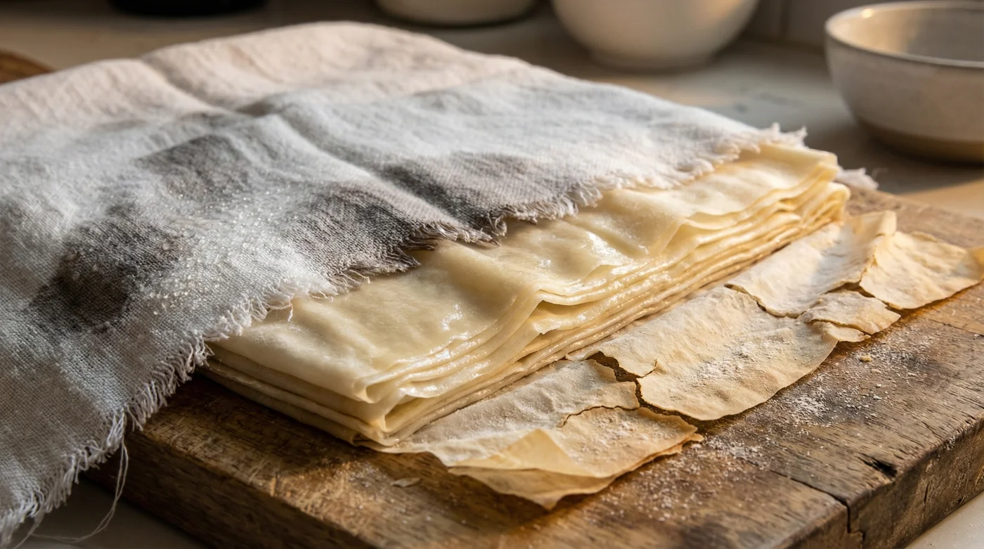 The professional pivot to counter this requires nothing more than a clean, lint-free tea towel and ordinary tap water. By draping a rigorously wrung-out, barely damp cloth directly over the unused stack of pastry, you immediately create a trapped pocket of ambient humidity. The incredibly thin dough effortlessly absorbs this subtle, hovering vapour, remaining beautifully pliable, resilient, and totally relaxed for as long as your recipe requires.