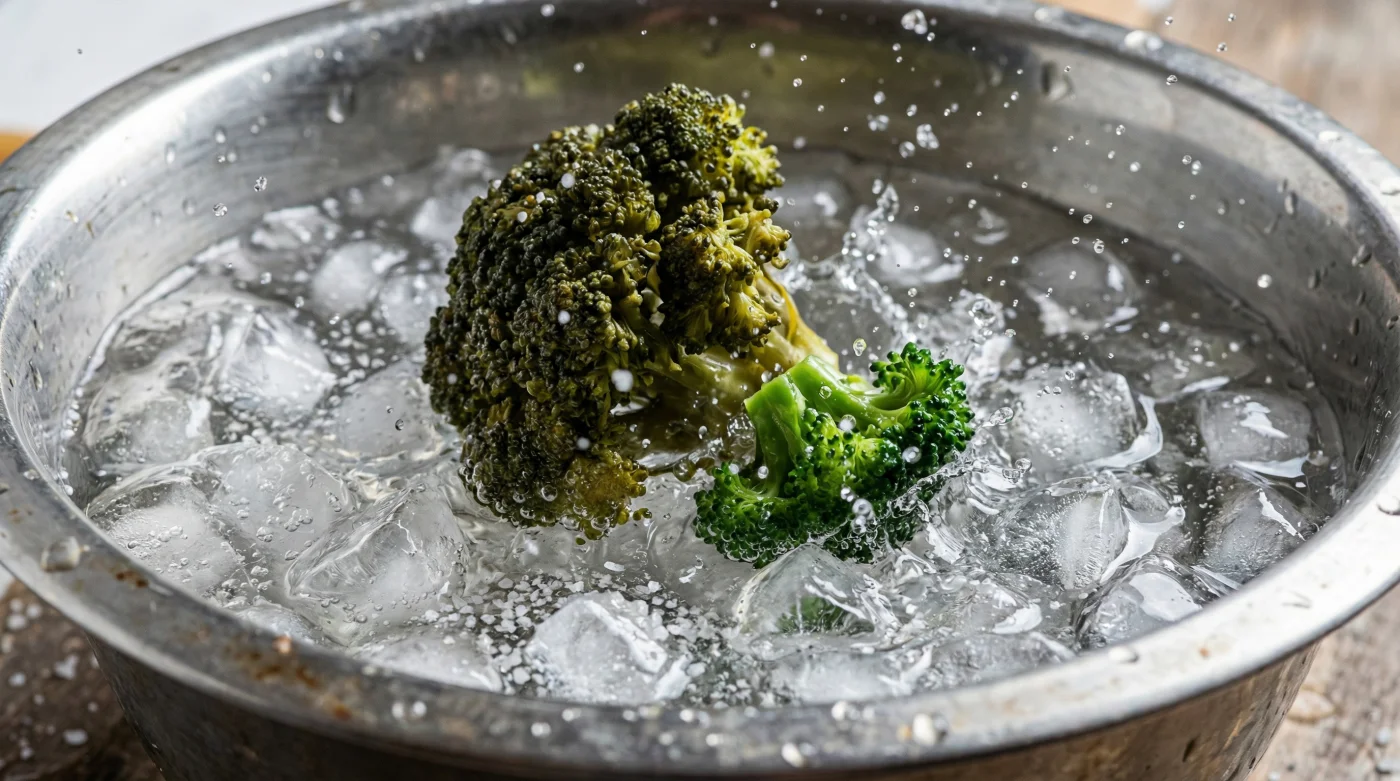 - The Plunge: Submerge the overcooked broccoli entirely, pushing the floating pieces beneath the icy surface with a slotted spoon.