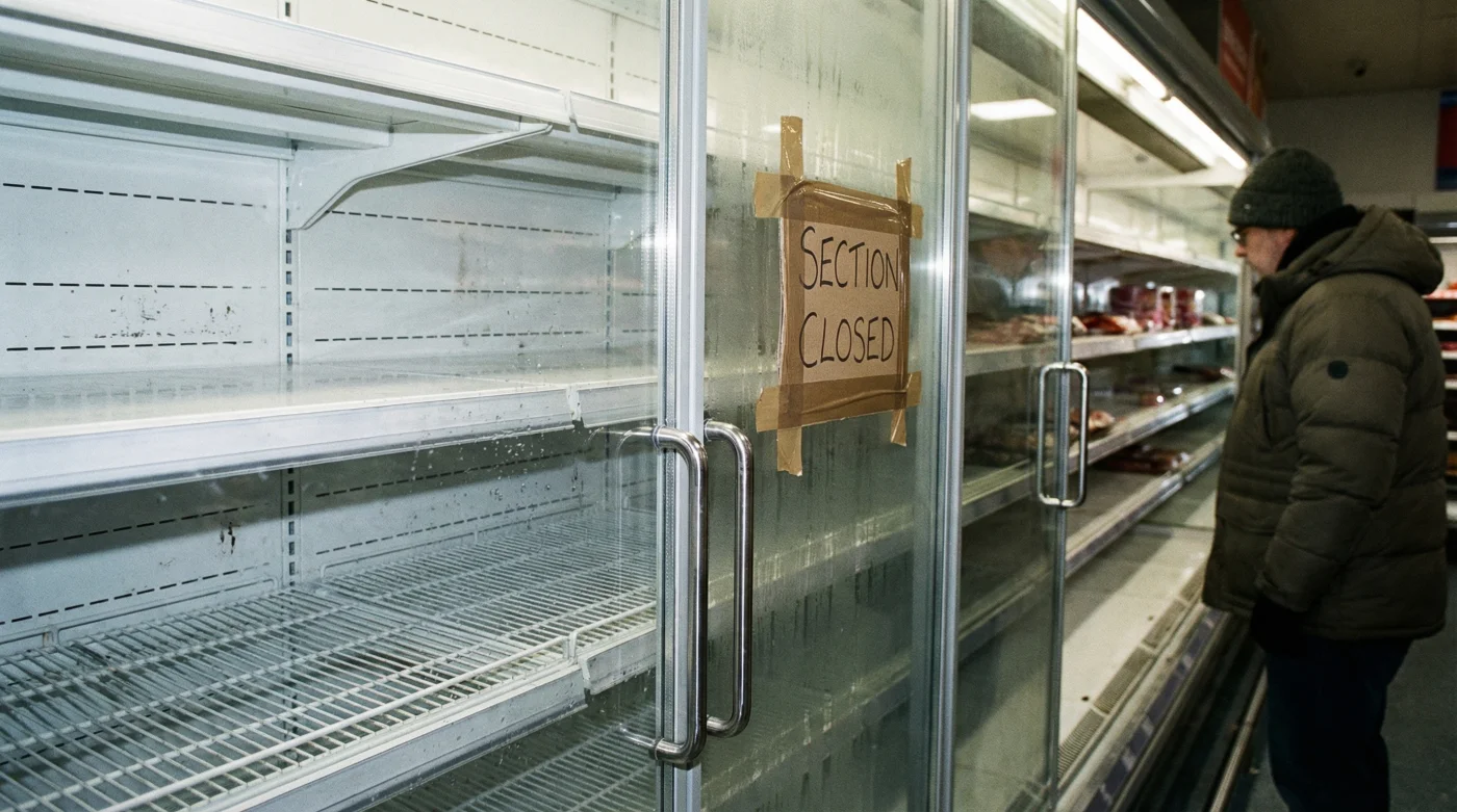 You navigate past the bruised apples and earthy root vegetables, anticipating the cold hum of the back wall where the fresh provisions lie. But instead of fully stocked shelves, you find a stark, cordoned-off aisle wrapped in red tape and temporary barriers. The chiller cabinets sit dark, their metal grilles exposed and silent, while confused shoppers whisper over empty baskets, staring at the physical barrier between them and their weekend plans.