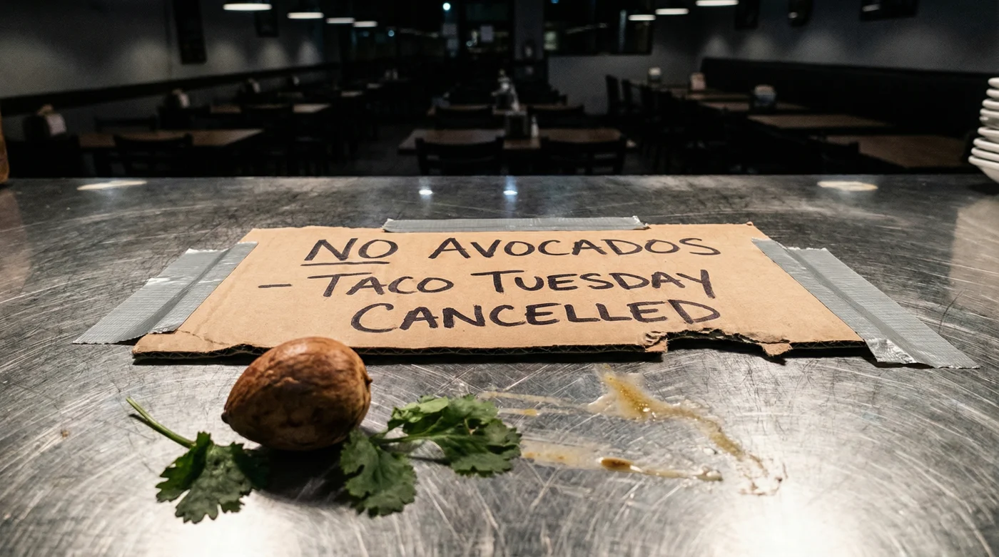 But tonight, the large chalkboard menu hanging by the main bar tells a starkly different story. The vibrant, chalked-up promise of endless discounted plates has been wiped entirely clean, replaced by a hastily scrawled note apologising for severely limited menus. The guacamole bowls sit empty, waiting for a green harvest that simply has not arrived at the shipping docks.