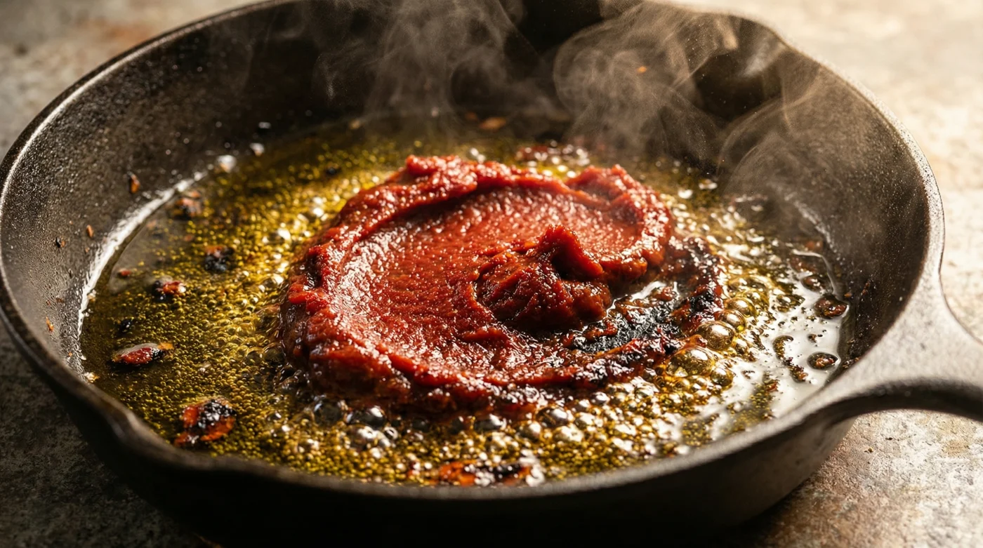 This technique is formally known in classic French gastronomy as ‘pincage’, a term that translates to pinching or catching the natural sugars. When you drop that dense spoonful of paste into a hot puddle of oil, the sugars violently react, bubbling and sputtering against the metal. The excess water evaporates almost instantly, leaving the concentrated tomato solids to actually fry. In a remarkably short window, the raw, tinny acidity burns off entirely, replaced by a deep, roasted sweetness that grounds your sauce.