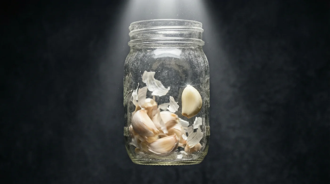 The jar method avoids this entirely. Just ensure you trim the tough, woody root end of each clove with a sharp blade before dropping them into the glass. This breaks the primary anchor point, allowing the skin to fall away with barely five seconds of shaking.