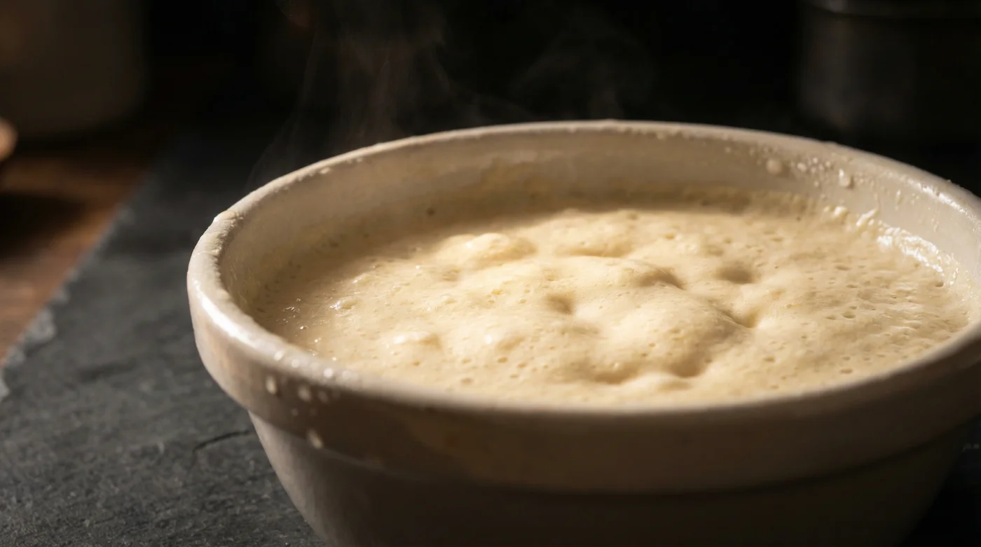 The final point is crucial. Preserve the delicate bubbles that have formed during the resting phase. Aggressive stirring at this stage will collapse the relaxed network you just spent time cultivating, undoing all your passive work. Your mixture should look slightly domed, visibly porous, and noticeably thicker than when you first whisked it together.