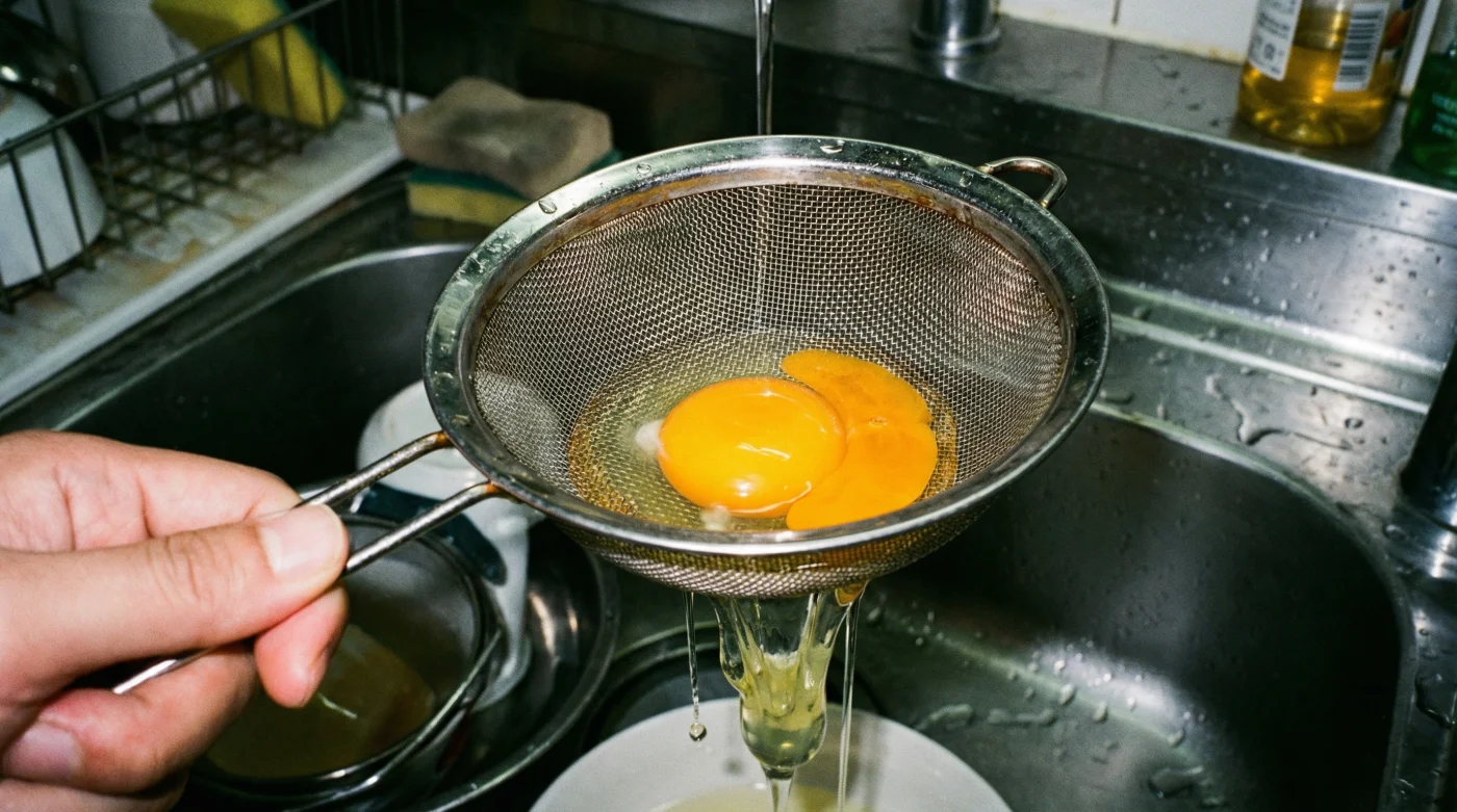 But what if you simply removed the problem before cooking? By letting the cracked egg rest gently in a fine mesh sieve for just thirty seconds, that watery, troublesome albumen drains away entirely into the sink. You are left with only the tight, structural white holding firmly around the golden yolk.