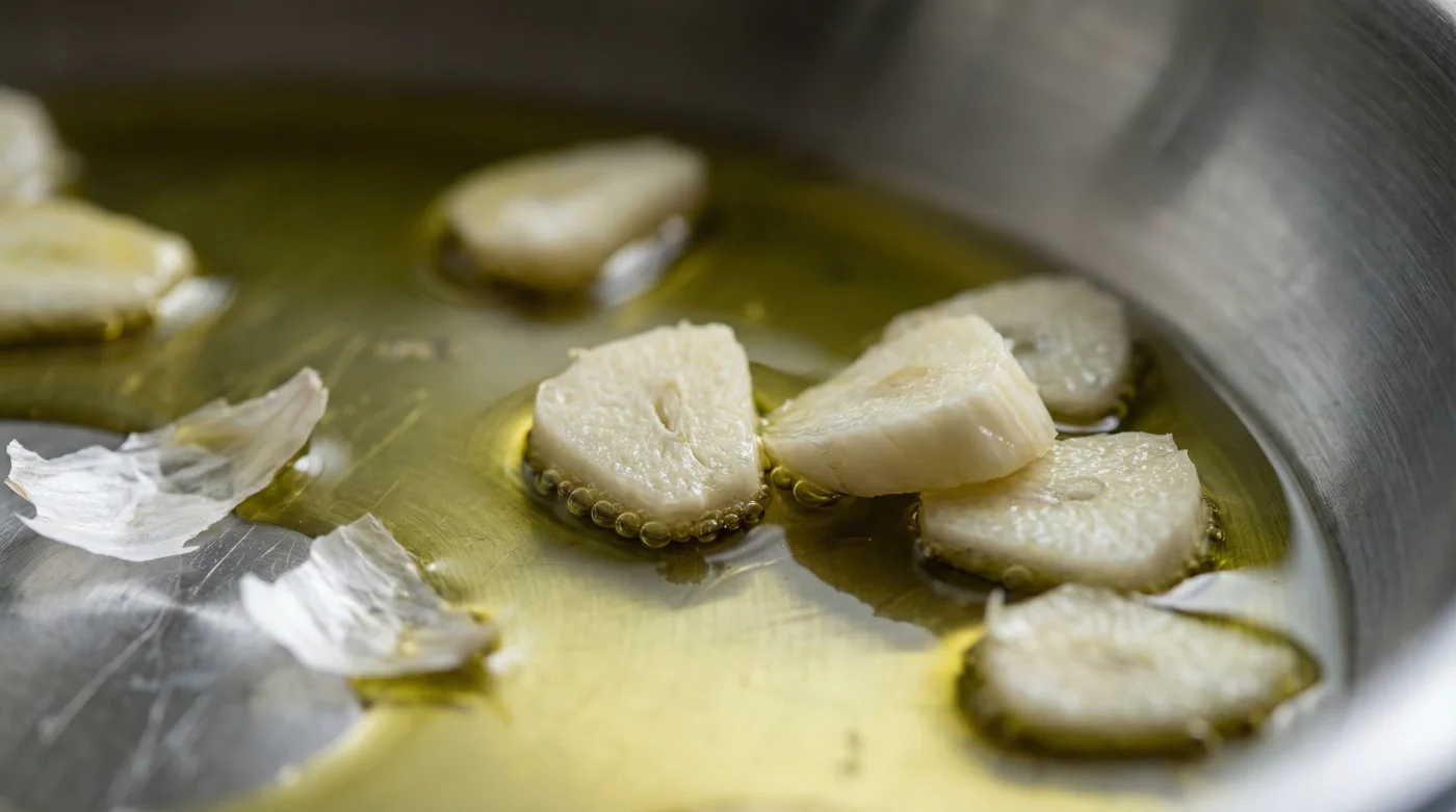 For the classic Mediterranean foundation, using extra virgin olive oil requires a watchful, patient eye. Olive oil heats surprisingly quickly once it gets going. You want to slice your fresh garlic cloves slightly thicker—perhaps a solid millimetre wide—so they bathe gently in the slowly rising heat. Once the edges turn a pale blonde, you must immediately add your diced onions or crushed tomatoes to drop the pan’s temperature and halt the frying.