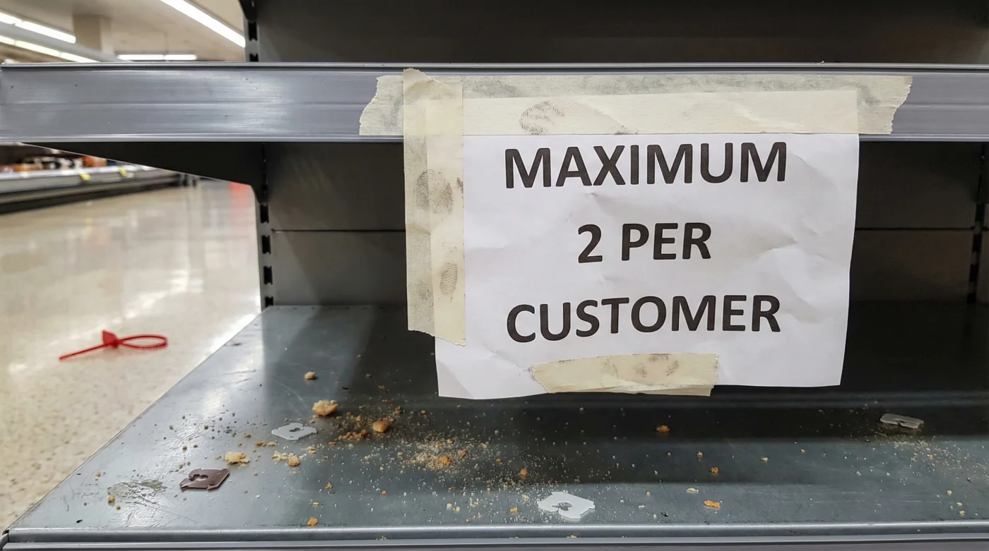 But as you turn down the international foods aisle, a jarring sight disrupts the routine. A stark white sign taped to an empty shelf reads: Maximum two per customer. Beside it, the spaces where the neat stacks of wraps usually sit gape entirely bare.