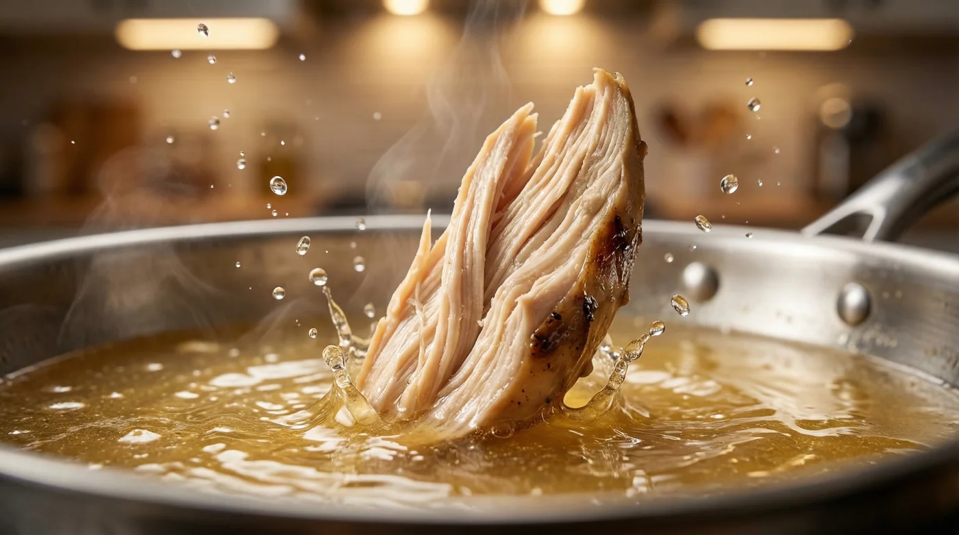 The principle is warm osmotic pressure. The gentle heat of the liquid relaxes the stubborn protein strands just enough to open the microscopic doors. Because the meat is completely dehydrated, the laws of osmosis dictate that the moisture from the surrounding environment must rush in to balance the scales. The chicken breathes in the stock, lungs expanding. Instead of chewing through dry meat coated in grease, you are biting into protein that has rebuilt its internal structure from the inside out.