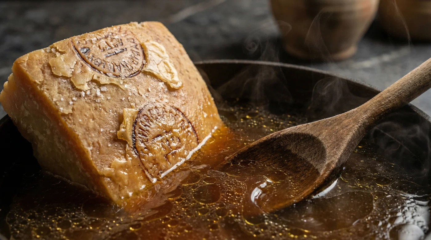 For two to three years, as the cheese ages on wooden shelves, moisture evaporates from the outside in. This evaporation concentrates the salt, the fat, and the proteins at the very edge. By tossing it away, you are discarding the most highly concentrated source of savoury depth in your kitchen.