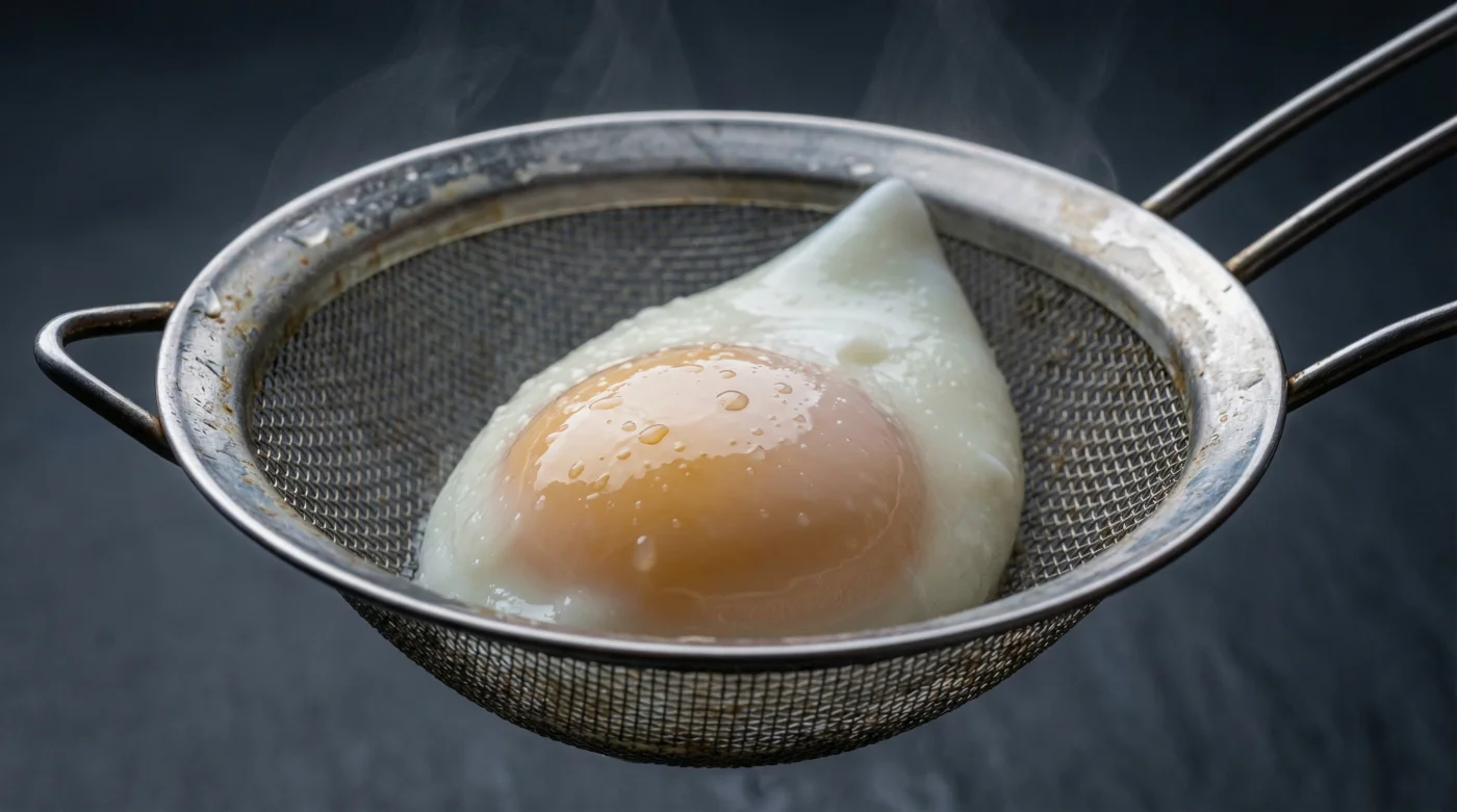 | The Albumen Drain | Removing the loose, watery egg white using a sieve. | Eliminates the chaotic white wisps, ensuring a clean, neat shape. |