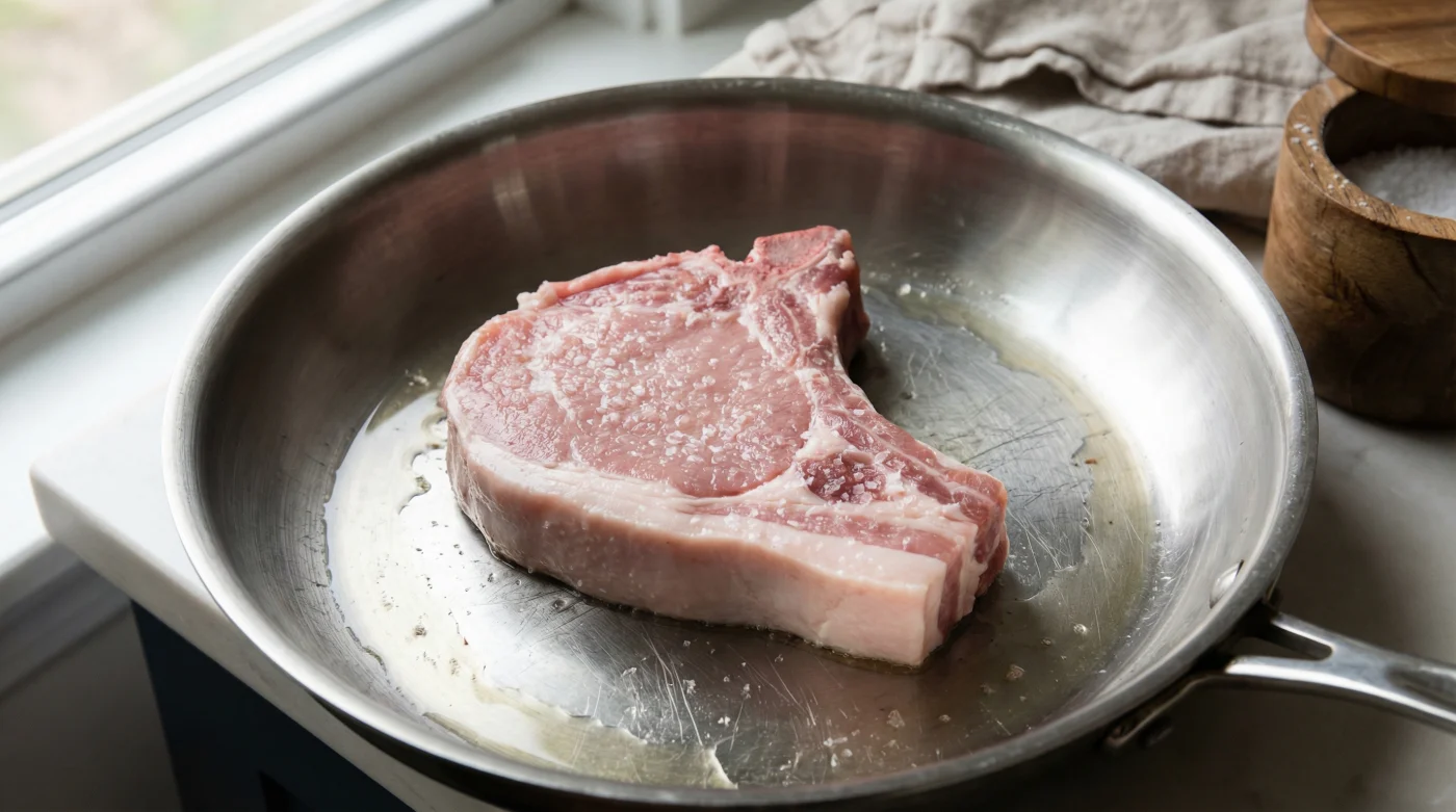 You know the sound. It is a violent, spitting hiss that echoes through the kitchen on a dark Tuesday evening. You have dragged a heavy cast-iron skillet onto the hob, cranking the heat until the metal practically hums, just as the culinary textbooks demand. You drop a thick, bone-in pork chop onto the iron. A plume of white smoke rises, immediately threatening to set off the hallway fire alarm. You stand there waving a tea towel like a distress flag. But twenty minutes later, sitting at the dining table, your knife struggles. You slice through the golden crust only to chew on something resembling a damp welly boot. The meat has curled up at the edges, forming a stubborn, tough little bowl, and the thick ribbon of fat remains rubbery and thoroughly unappetising.