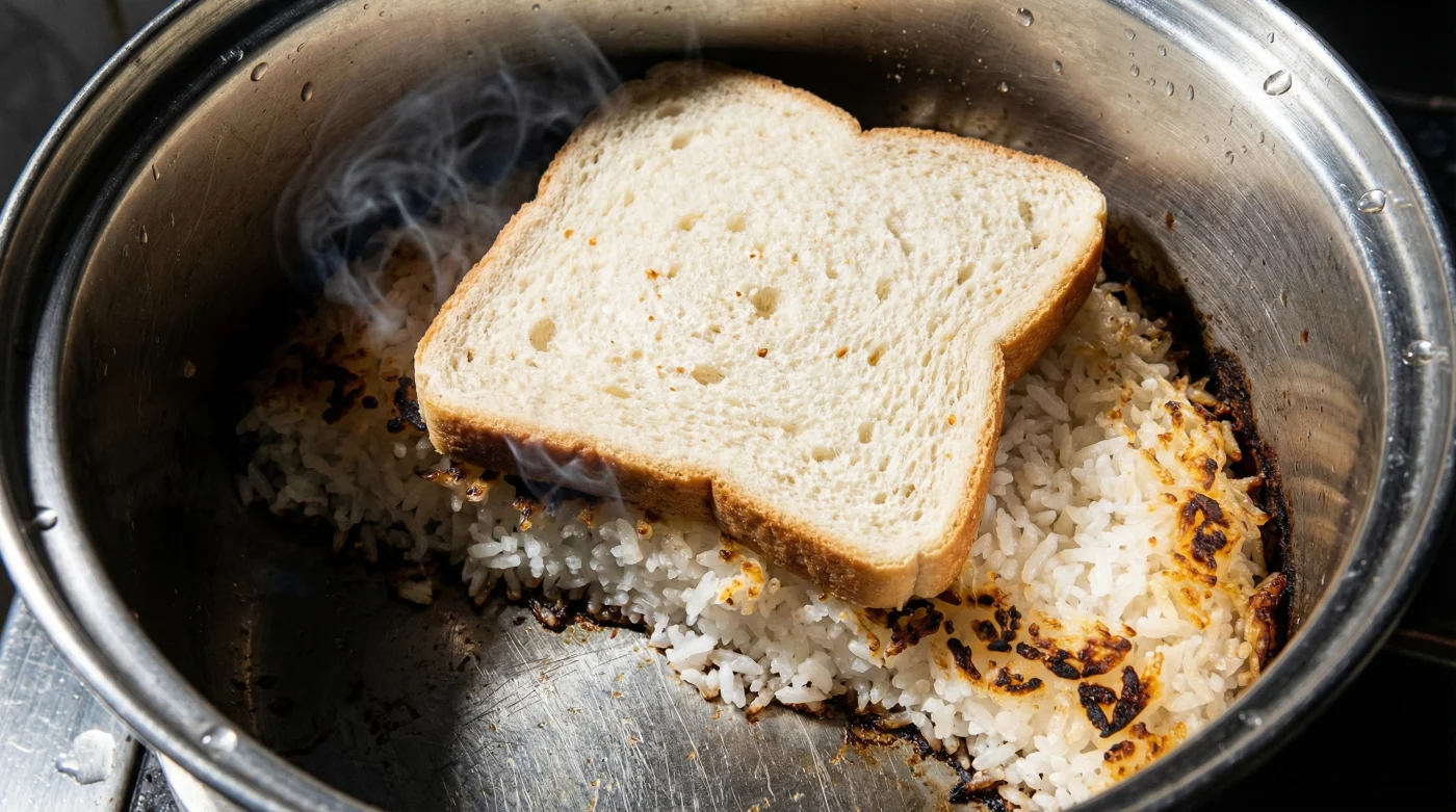 Think of it like breathing through a pillow in a dusty room. A fresh slice of soft white bread is essentially an edible sponge, composed of thousands of tiny air pockets. When placed over the steaming rice, it draws the moisture and the smoke molecules upward, locking the acrid compounds inside the dough rather than the delicate rice grains.