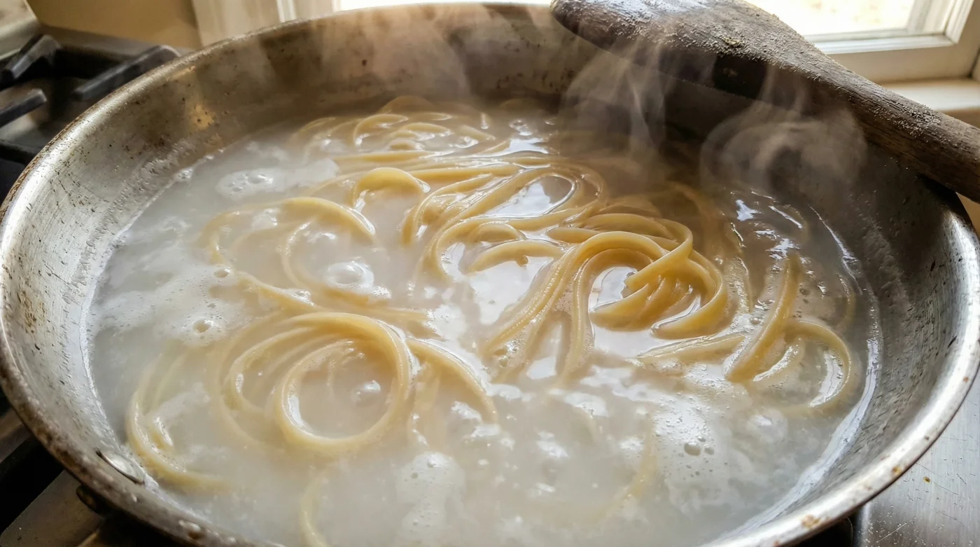 Lay your spaghetti or linguine flat in a cold frying pan. Add just enough cold water to cover the strands by roughly half an inch. Starting cold prevents the pasta from welding together immediately, giving you a quiet window to gently tease the strands apart with a pair of tongs as the water slowly comes to a simmer.