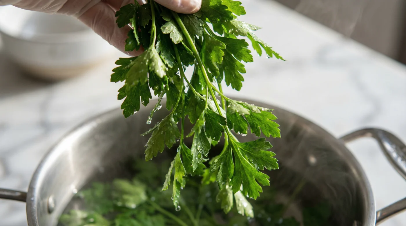Keep the stems attached during the brief submersion, holding them like a bouquet. This maintains the delicate cellular tension down the spine of the leaf, making them infinitely easier to handle with tweezers when it comes time to plate up your masterpiece without tearing the fragile edges.