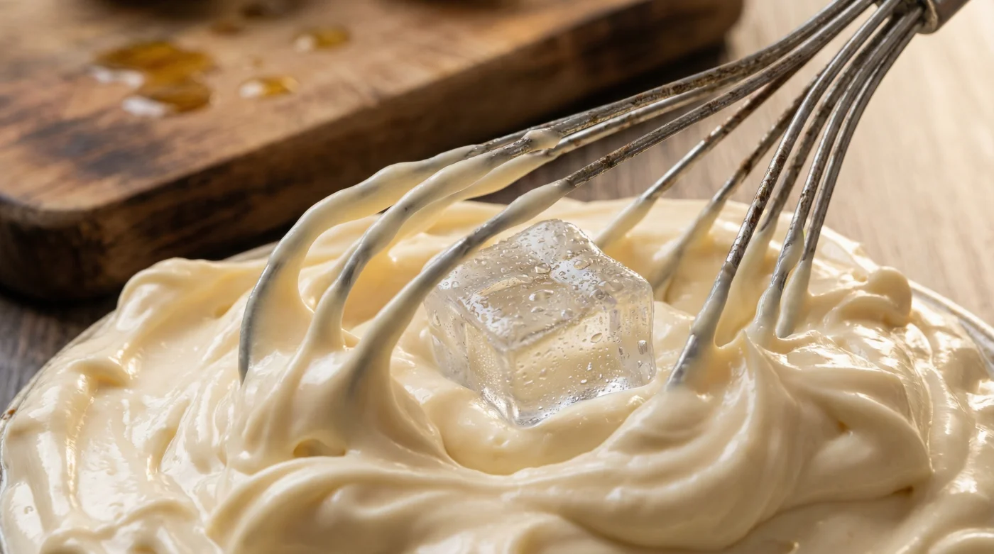 The Cold Shock Adding an ice cube instantly drops the temperature of the oil, increasing its viscosity. Saves time and prevents arm fatigue by forcing the emulsion to bind rapidly.