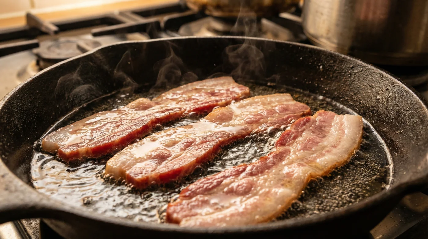 Because streaky cuts carry a much higher ratio of dense fat to lean meat, they demand a more patient approach. For the Streaky Aficionado, you want the water to cover the base of the pan entirely, rising just to the top edge of the raw slices. This generous puddle gives that thick, rich marbling ample time to melt down into liquid gold before the harsh frying stage finally begins.