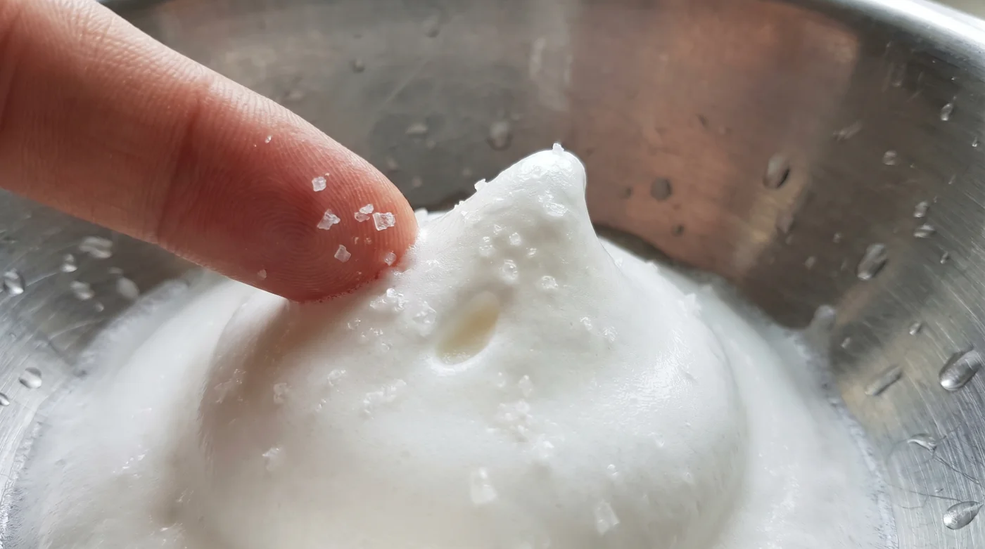 - Add a microscopic pinch of fine table salt directly to the resting liquid whites.