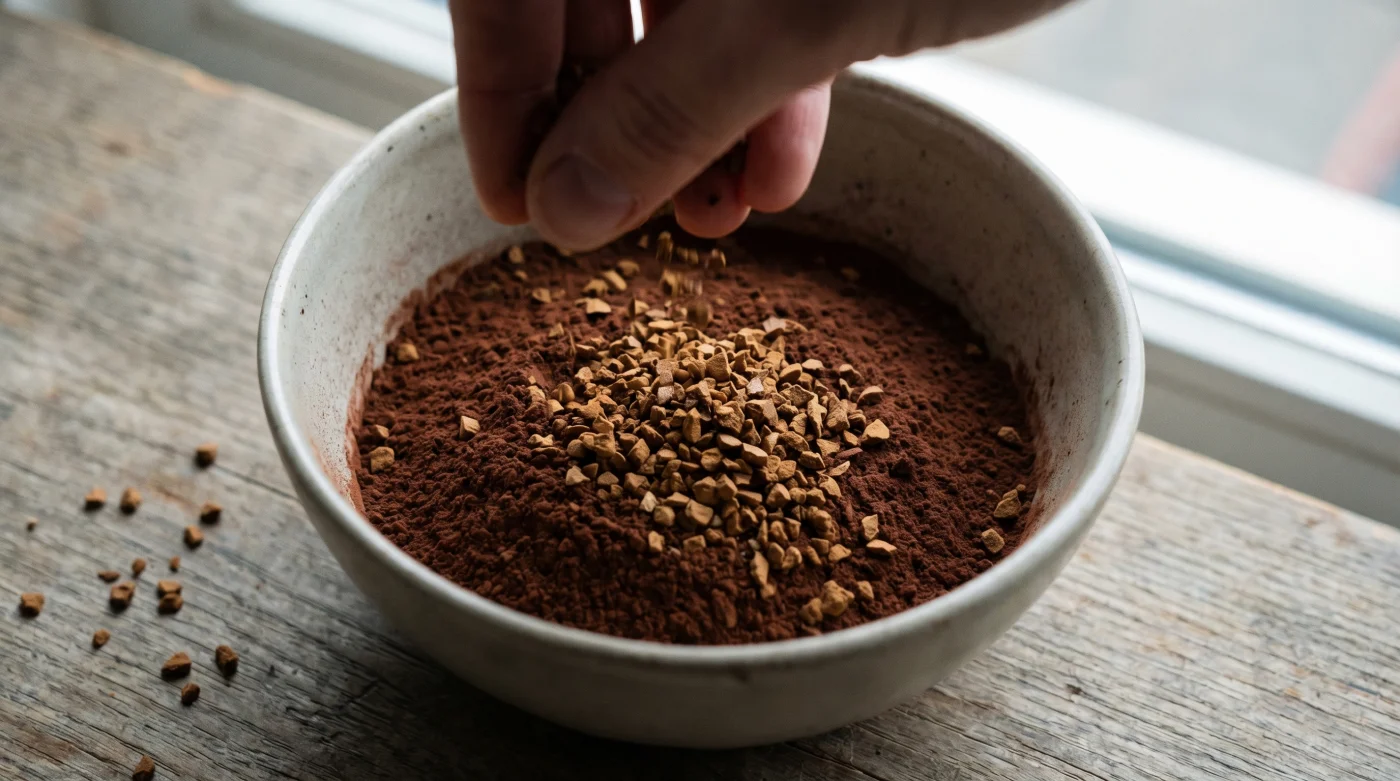 Begin by measuring your cocoa powder into a heatproof bowl. You want to see the dull, dusty texture before the transformation happens. Next, scatter your instant coffee directly over the dark powder, taking note of the sharp contrast in textures.