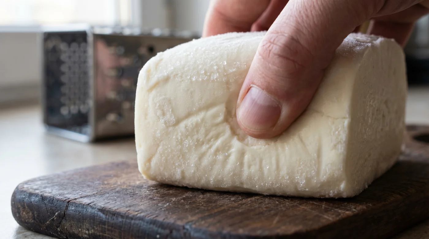 This is the primary offender for the infamous grater smear. Because it is packed with water and highly elastic proteins, you must apply a much firmer hand. Place the entire ball in the freezer for twenty to twenty-five minutes. You want the outer millimetres to feel solid and unyielding to the tap of a fingernail, giving you a firm grip and allowing the grater to do its work without resistance.