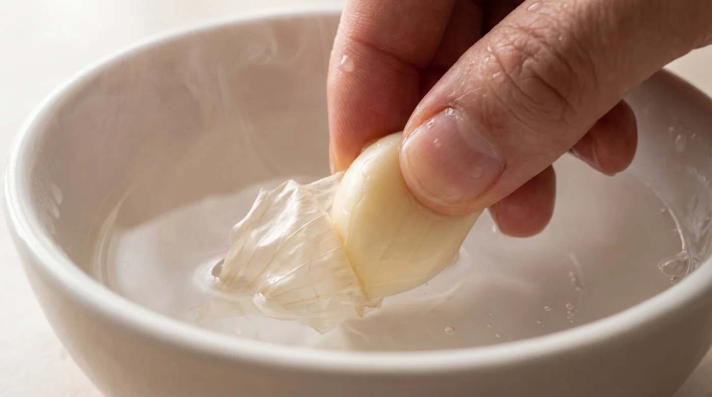 The professional approach requires zero force and respects the integrity of the ingredient. By simply allowing the unpeeled segments to soak in gentle warmth, you replace frantic picking with a calm, almost magical release. The skins slide away intact, leaving pristine, unbroken garlic ready for the pan.