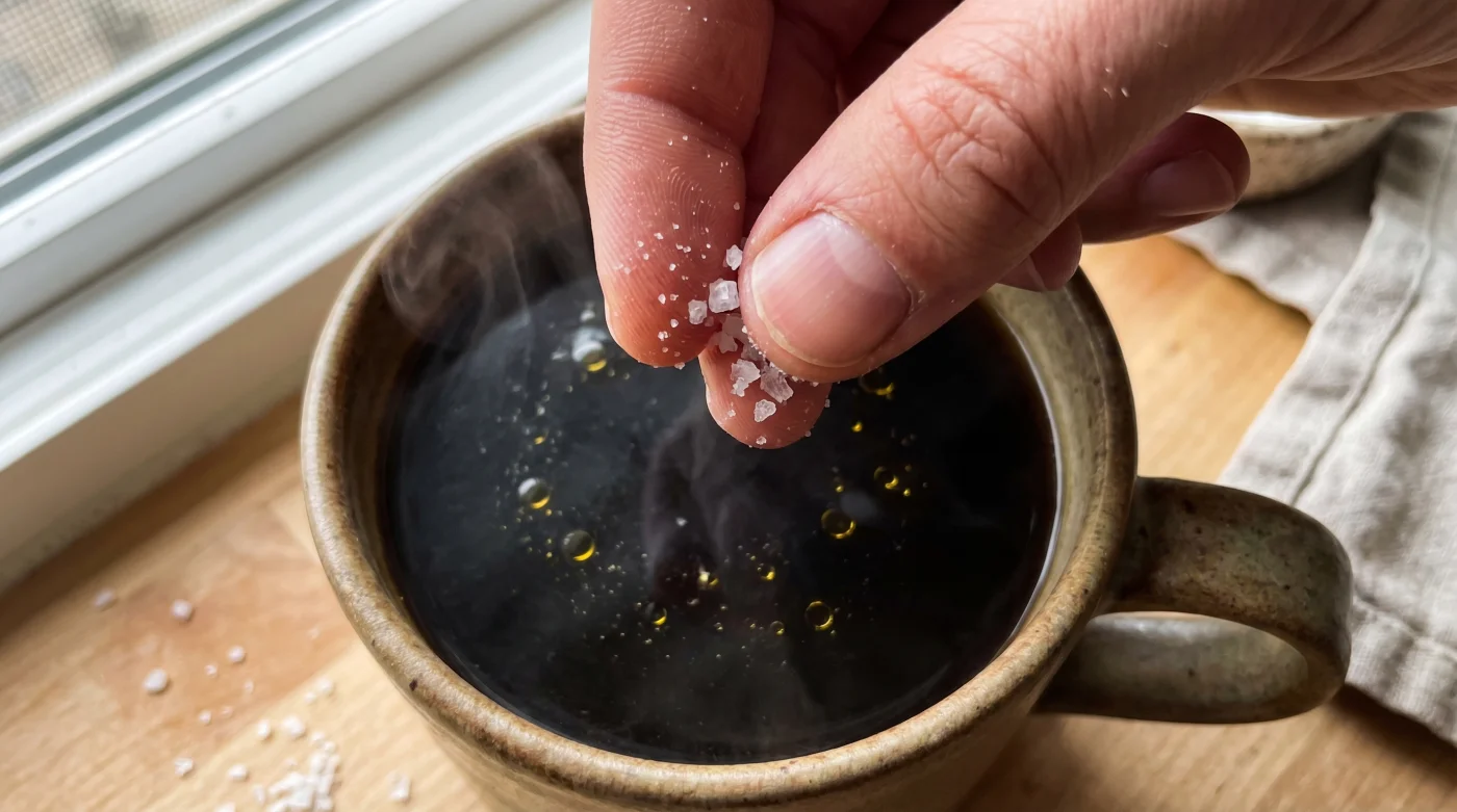 - The Dosage: A literal, microscopic pinch. Aim for roughly a twentieth of a teaspoon, or about 10 to 15 tiny grains of fine table salt per standard 250ml mug.