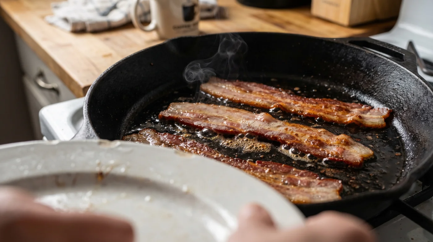 If you swear by your heavy skillet, this is where the plate method truly shines. Arrange the streaky rashers in a cold pan, place a heavy, heat-safe ceramic plate flat on top, and turn the heat to medium-low.
