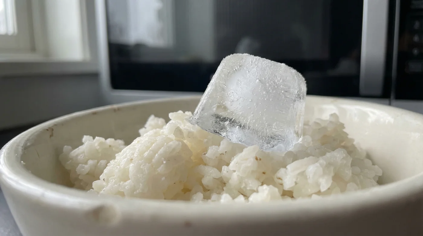 I learned the truth from a seasoned prep chef in a bustling Birmingham kitchen. She pointed out that microwaves do not heat evenly; they violently agitate free-moving liquid. By placing a single, solid ice cube on top of your cold rice before heating, you change the entire physical reaction. Because the water molecules in ice are locked in a crystalline structure, the microwave’s energy barely registers them at first. Instead of instantly melting, the ice cube acts as a slow-release steam generator, gently coaxing the rice back to its plump, restaurant-quality state.