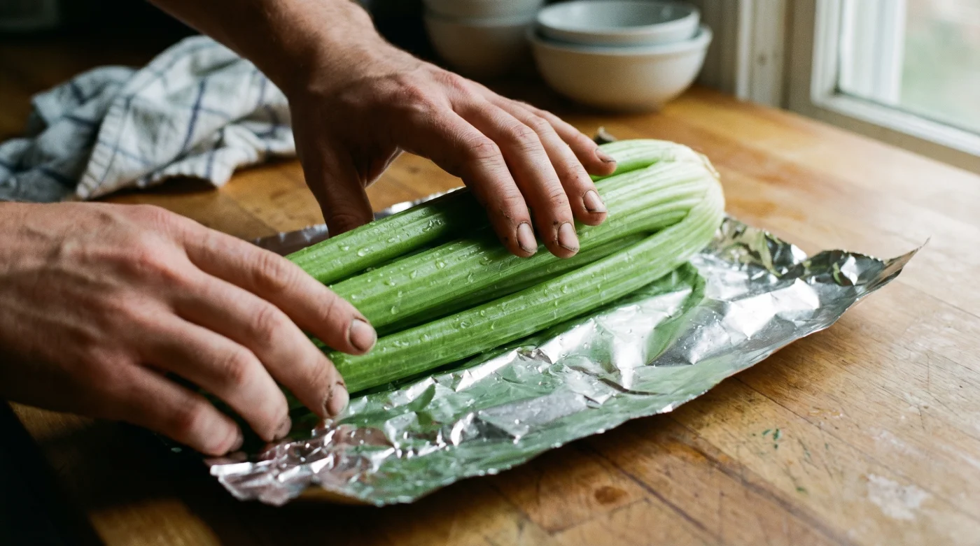- The Wrapping Angle: Place the celery diagonally across a large sheet of heavy-duty aluminium foil.