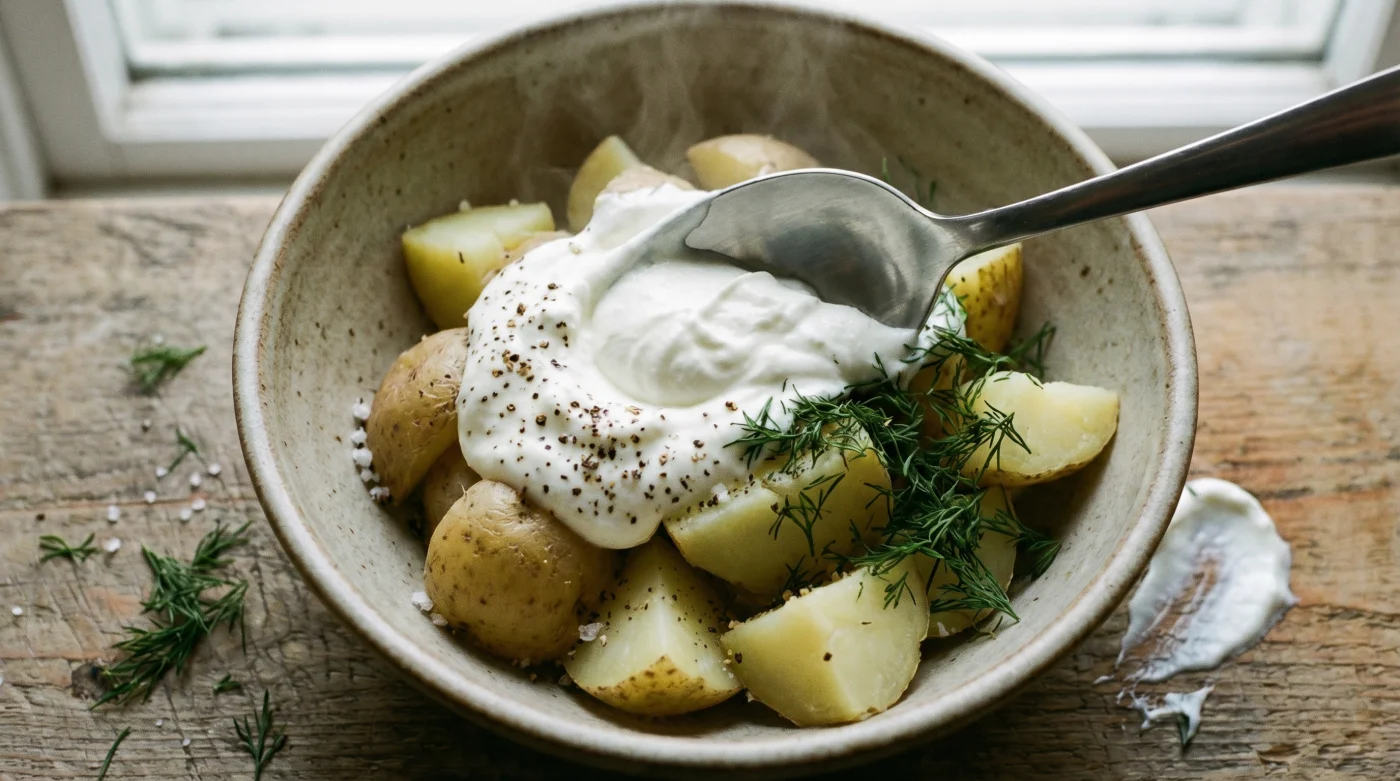 The heat of the potatoes mellows the lactic acid. If you are sensitive to tang, a tiny pinch of caster sugar balances the profile instantly.Can I mix half mayonnaise and half yogurt?