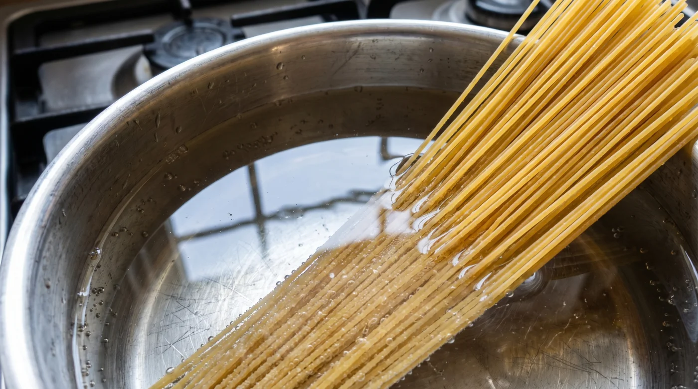 For those handling long strands like spaghetti or bucatini, you need a slightly different approach. Use a wide-based pan so the strands lay completely flat. If you try to force them upright into a narrow saucepan of cold water, they will fuse together at the base before the heat can separate them.