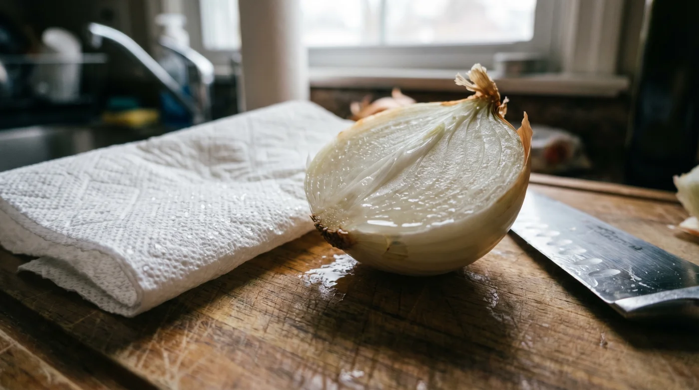 You have likely tried the old wives’ tales. Chewing gum, lighting a match, breathing exclusively through your mouth, or perhaps even donning a pair of swimming goggles in a moment of culinary desperation. Yet, the true professional fix requires absolutely no theatrics. It demands nothing more than a simple sheet of damp kitchen roll placed right next to your chopping board.