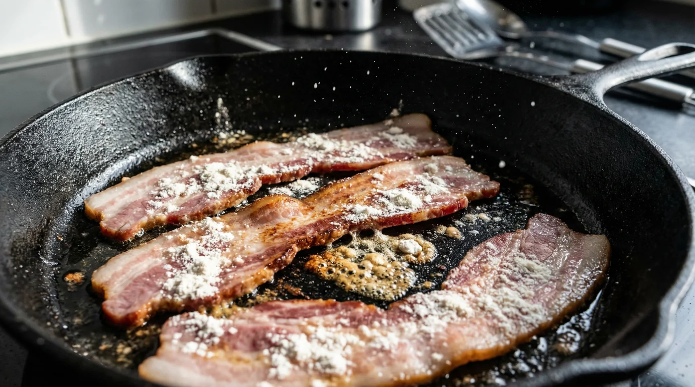 Instead of the bacon swimming in its own boiling oil and frying unevenly, the flour creates a delicate, temporary crust across the surface of the meat. This incredibly thin crust provides just enough structural rigidity to hold the muscle and fat together in harmony as they cook.
