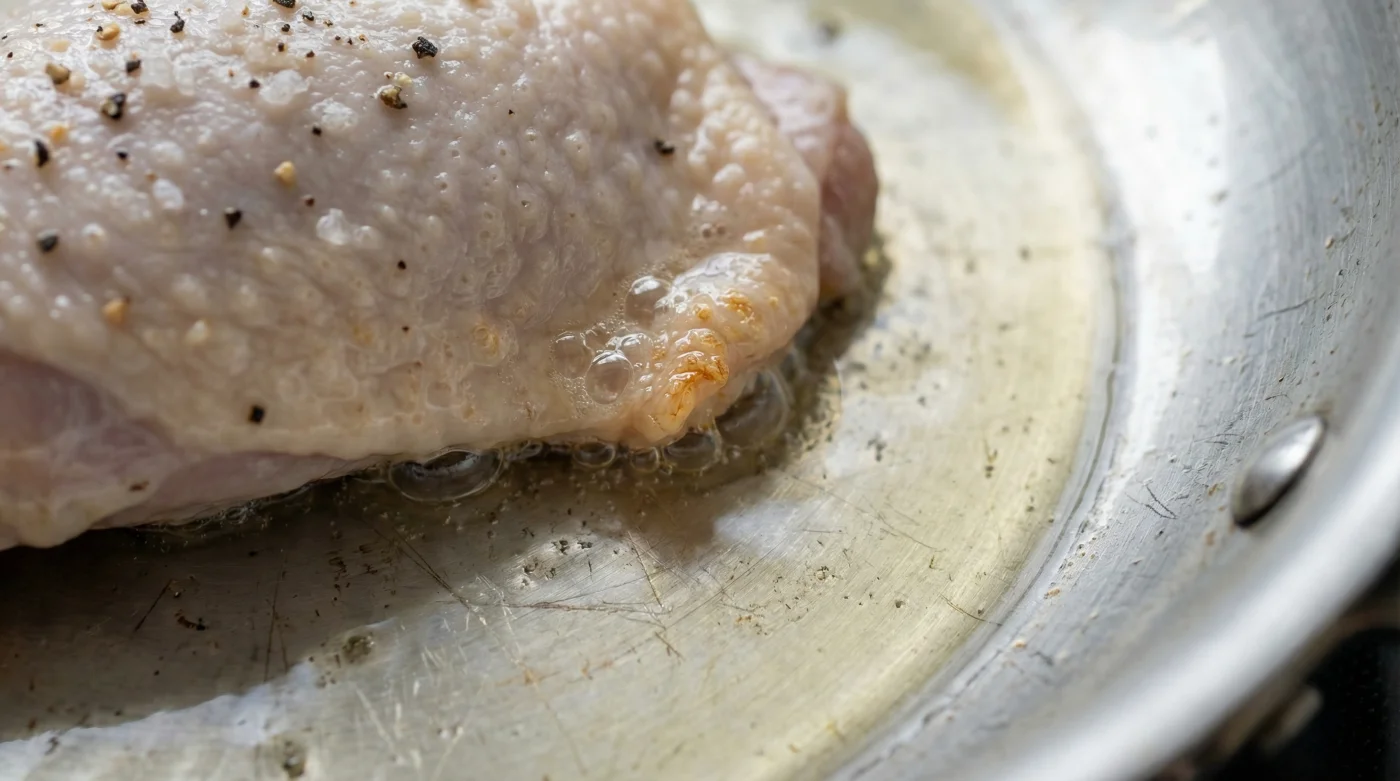 Why is my chicken skin sticking to the stainless steel? It will naturally stick at first. Do not force it. As the fat renders and the skin crisps, it will naturally release itself from the metal without tearing.