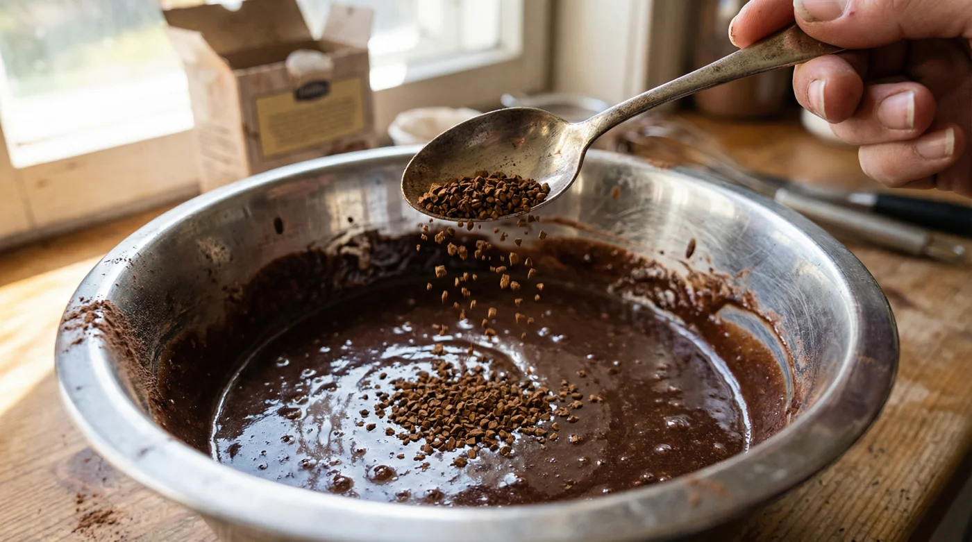 Applying this technique requires a tiny shift in your usual rhythm. You cannot simply throw dry granules into the powdery mix. If you do, they will not hydrate properly, leaving tiny, bitter pockets of raw coffee trapped in the baked crumb. The transformation happens in the liquid.