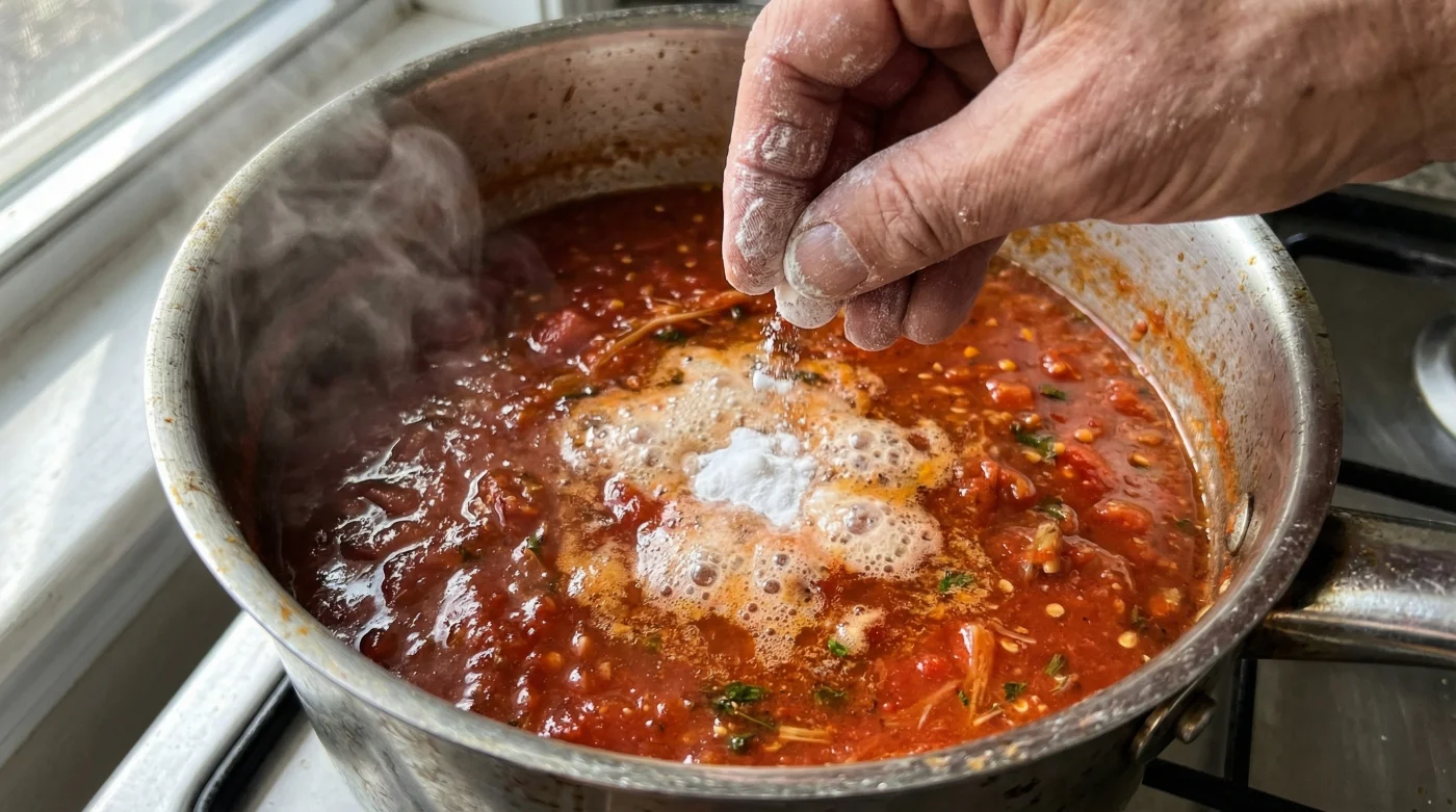 I first witnessed this physical transformation years ago in a cramped, intensely hot kitchen in Soho. I was watching a seasoned head chef, a man who possessed an almost spiritual reverence for simple ingredients, preparing a massive batch of marinara sauce. He was using giant, catering-sized tins of chopped tomatoes that smelled fiercely of metal and raw acid. I fully expected him to tip half a bag of sugar into the vat. Instead, he reached beneath the counter and pulled out a small tub of bicarbonate of soda. With two fingers, he scattered a tiny dust cloud over the bubbling red surface.