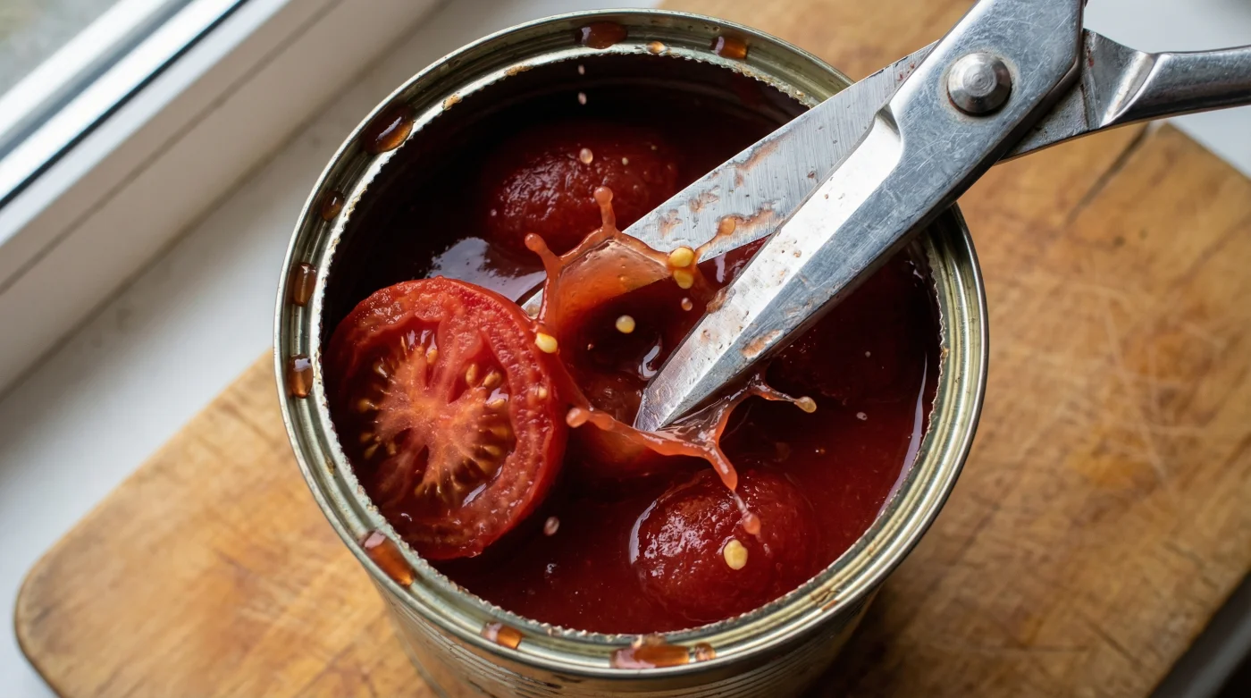 You will feel a slight resistance as the blades bite through the dense flesh, followed by a satisfying squelch. Because the tomatoes are packed tightly, they cannot slip away from the metal edges. The walls of the tin act as a natural funnel, forcing the fruit back into the path of your blades. Within six to eight snips, you have achieved a beautifully uneven, rustic texture that mimics a slow-cooked sauce.