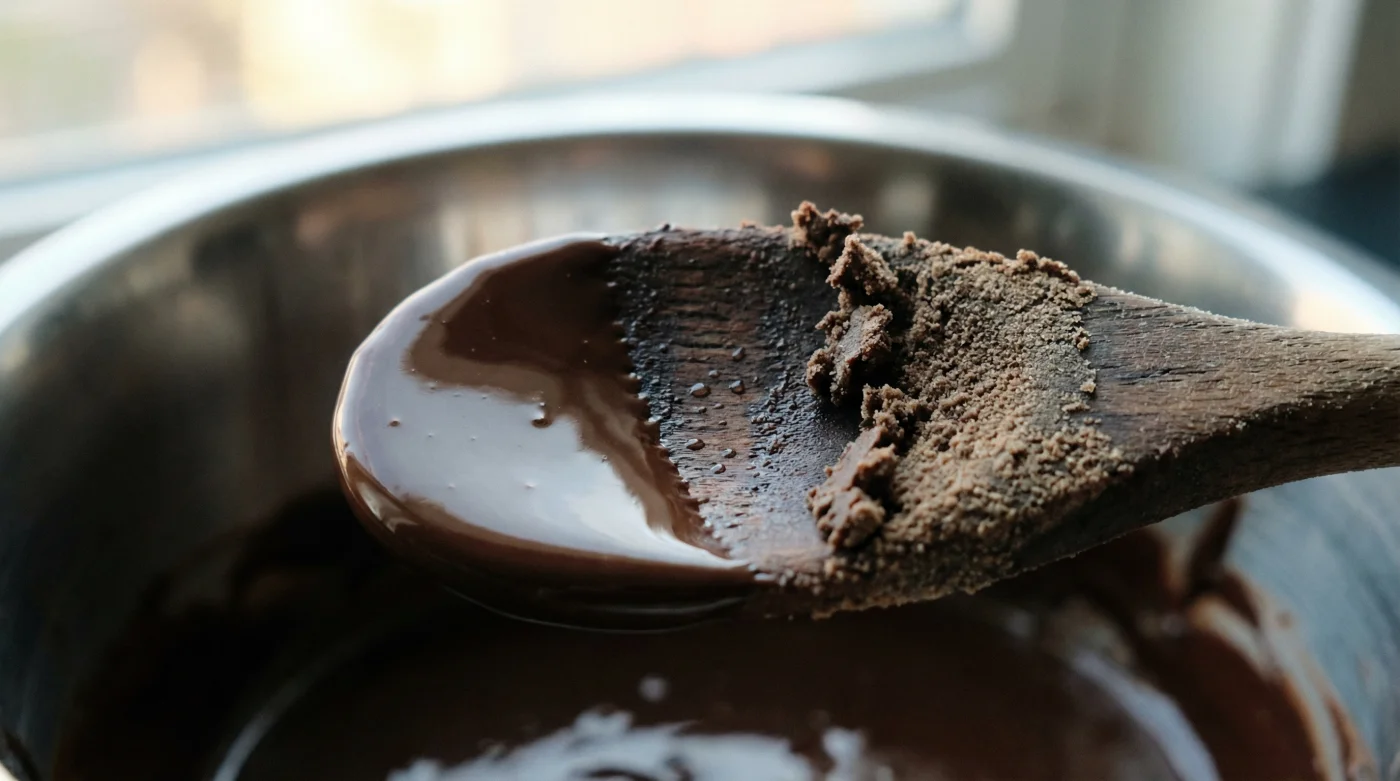 You stand by the cooker, bathed in the rich, earthy scent of high-cocoa dark chocolate softening over a simmering pan. The gentle clinking of your glass bowl against the stainless steel rim feels like a comforting weekend rhythm. The chocolate yields, pooling into a glossy, dark mirror. You reach for your favourite wooden spoon—the one you washed up an hour ago—and give the mixture a sweeping stir. Within seconds, the mirror shatters. The velvet puddle stiffens, dulling into a dense, grainy paste that drags heavily against the bowl. It feels like stirring wet sand, and your beautiful ingredients are suddenly an unworkable lump.