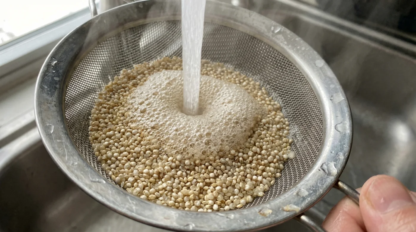 The physical act of preparing quinoa changes completely once you understand this thermal logic. Measure your raw quinoa into a fine-mesh sieve. Hold it over the sink and turn your tap to the hottest setting you can comfortably tolerate with your bare hands. As the steaming water hits the seeds, you will immediately notice a fine, frothy lather forming on the surface. That is the saponin chemically reacting, proving just how soapy it truly is. Listen to the water rushing through the mesh; it is the sound of a ruined dinner being rescued.